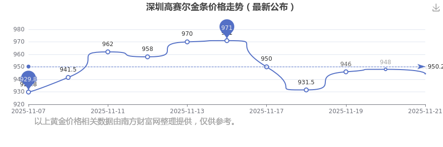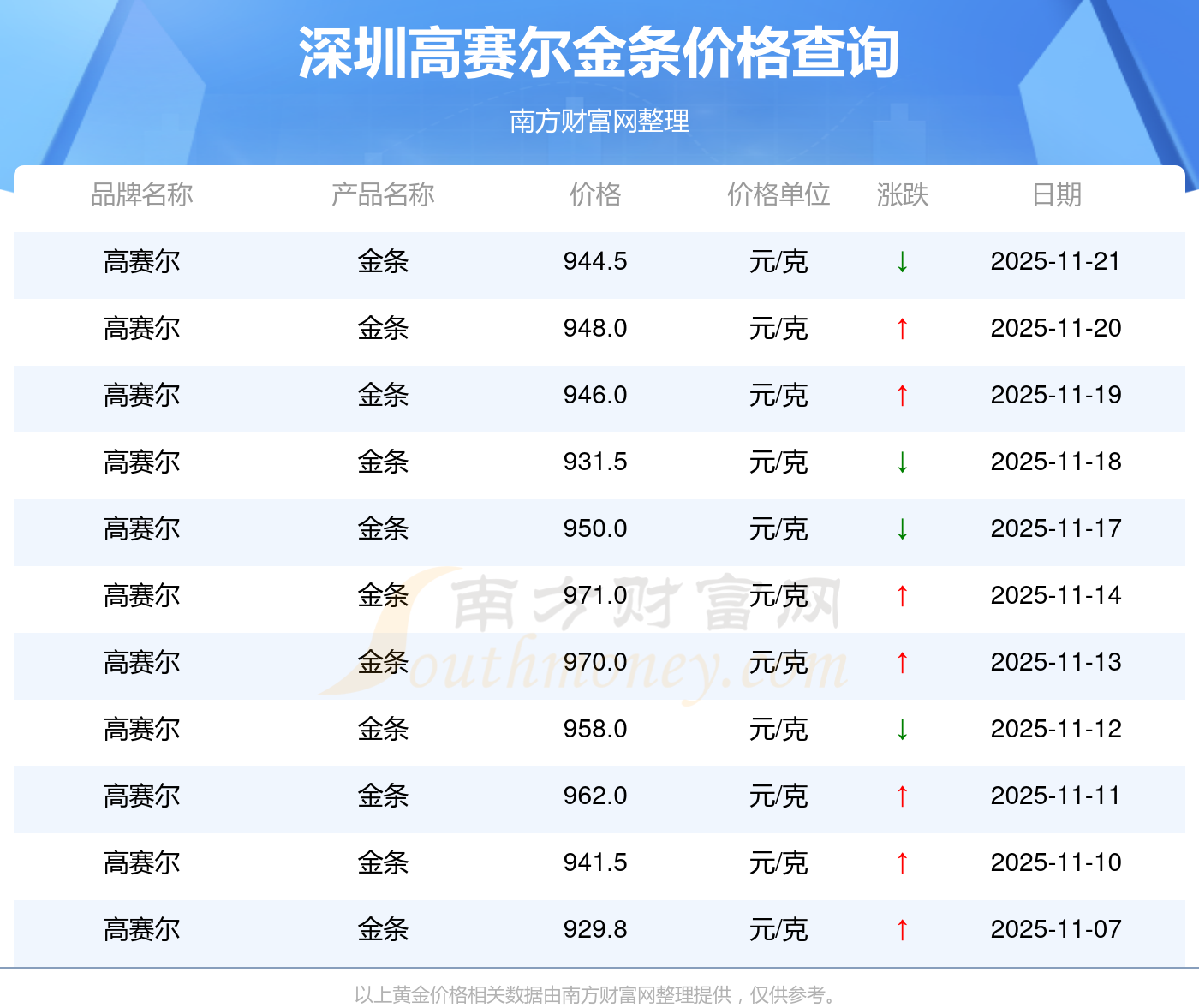 深圳高赛尔金条价格在 2025年11月21日为 944.5元/克。