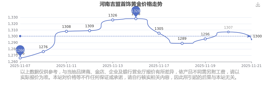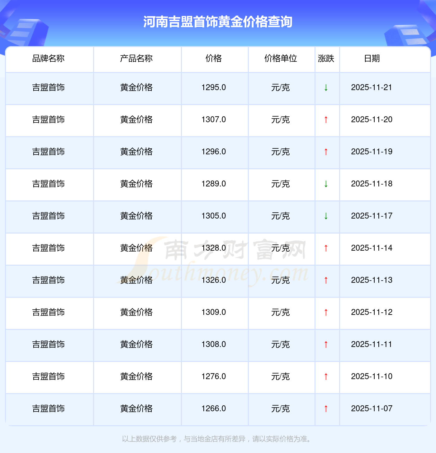 今日(2025年11月21日)河南吉盟首饰黄金价格最新价格为1295.0元/克。