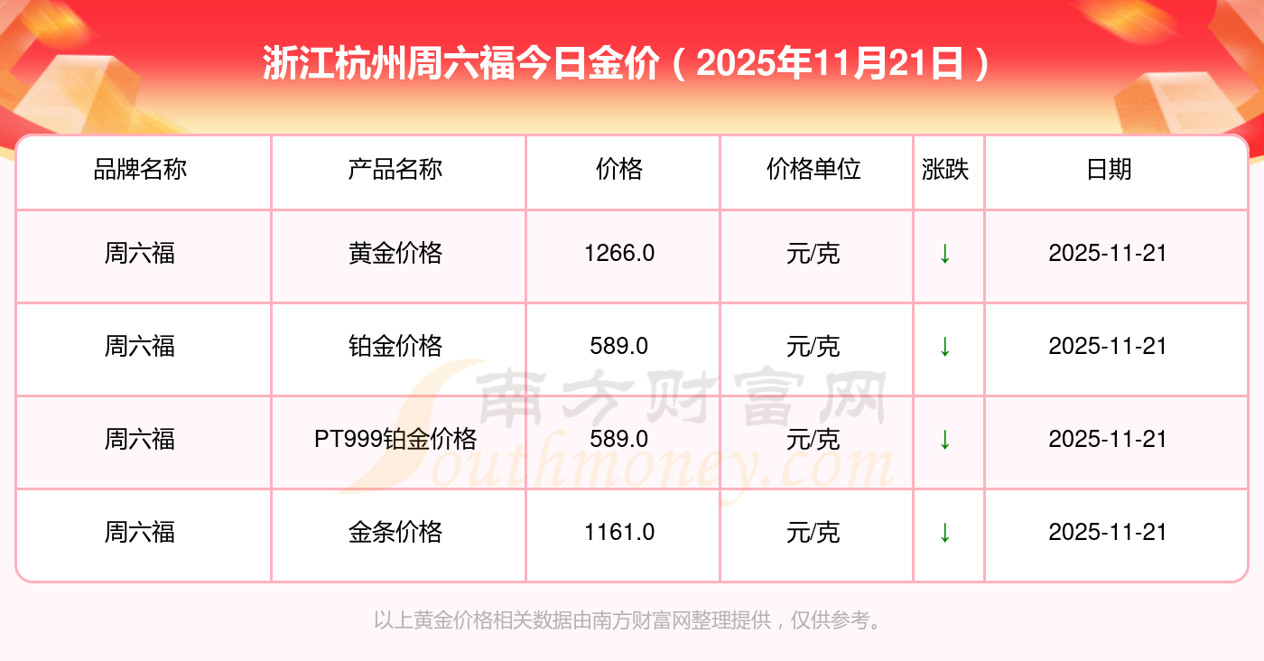 今日黄金价格查询_现在金价黄金一克多少钱,黄金价格是多少钱一克?2025年11月21日浙江杭州周六福黄金按克计价,现在多少钱一克?黄金价格1305.0元/克,铂金价格616.0元/克,饰品金价(内地)1305.0元/克,黄金饰品(香港)45110.0,铂金价格(香港)17570.0,金条价格(香港)40690.0,金条金价(内地)1143.0元/克,黄金价格1298.0元/克,铂金价格600.0元/克,足金价格1298.0元/克,黄金价格1266.0元/克。