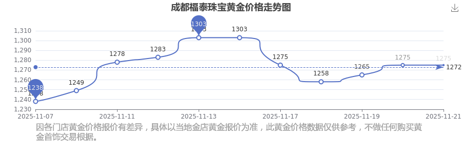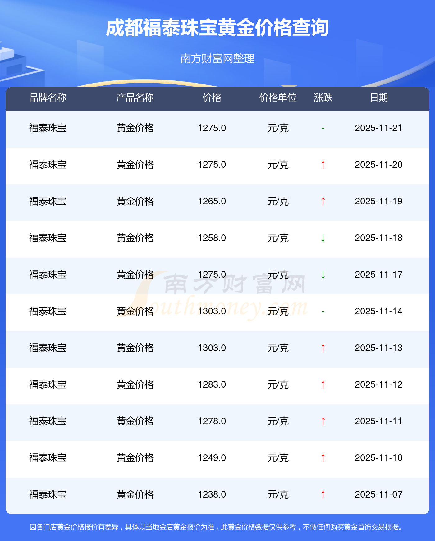 今日(2025年11月21日)成都福泰珠宝黄金价格是1275.0元/克。