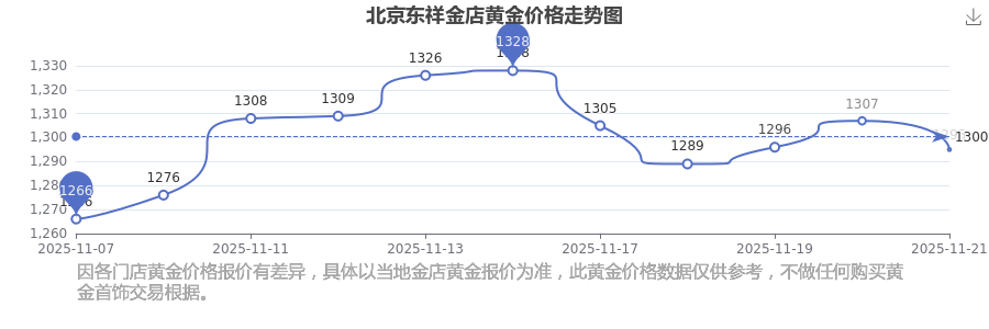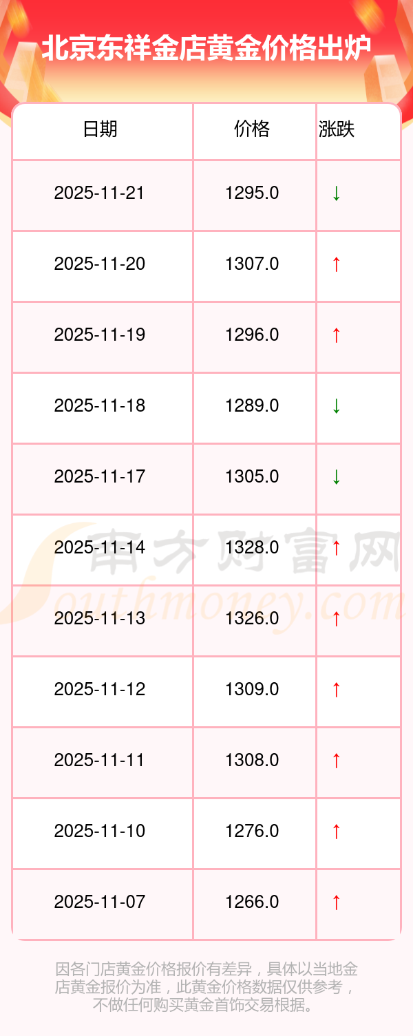 于 2025年11月21日,北京东祥金店黄金价格的克价为1295.0元/克。