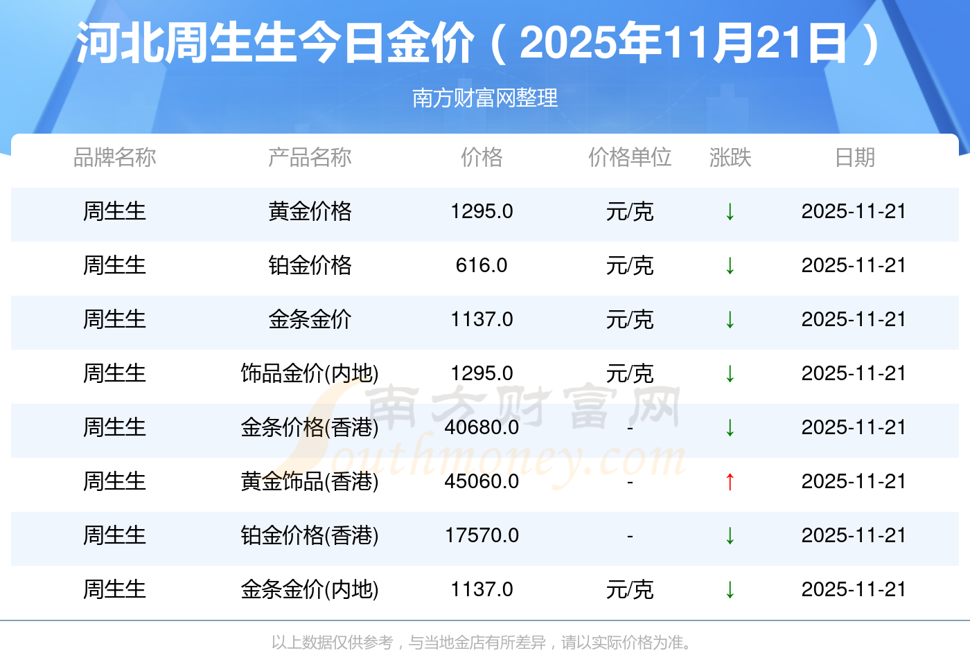 黄金价格1305.0元/克,铂金价格616.0元/克,饰品金价(内地)1305.0元/克,黄金饰品(香港)45110.0,铂金价格(香港)17570.0,金条价格(香港)40690.0,金条金价(内地)1143.0元/克,黄金价格1298.0元/克,铂金价格600.0元/克,足金价格1298.0元/克,黄金价格1266.0元/克。