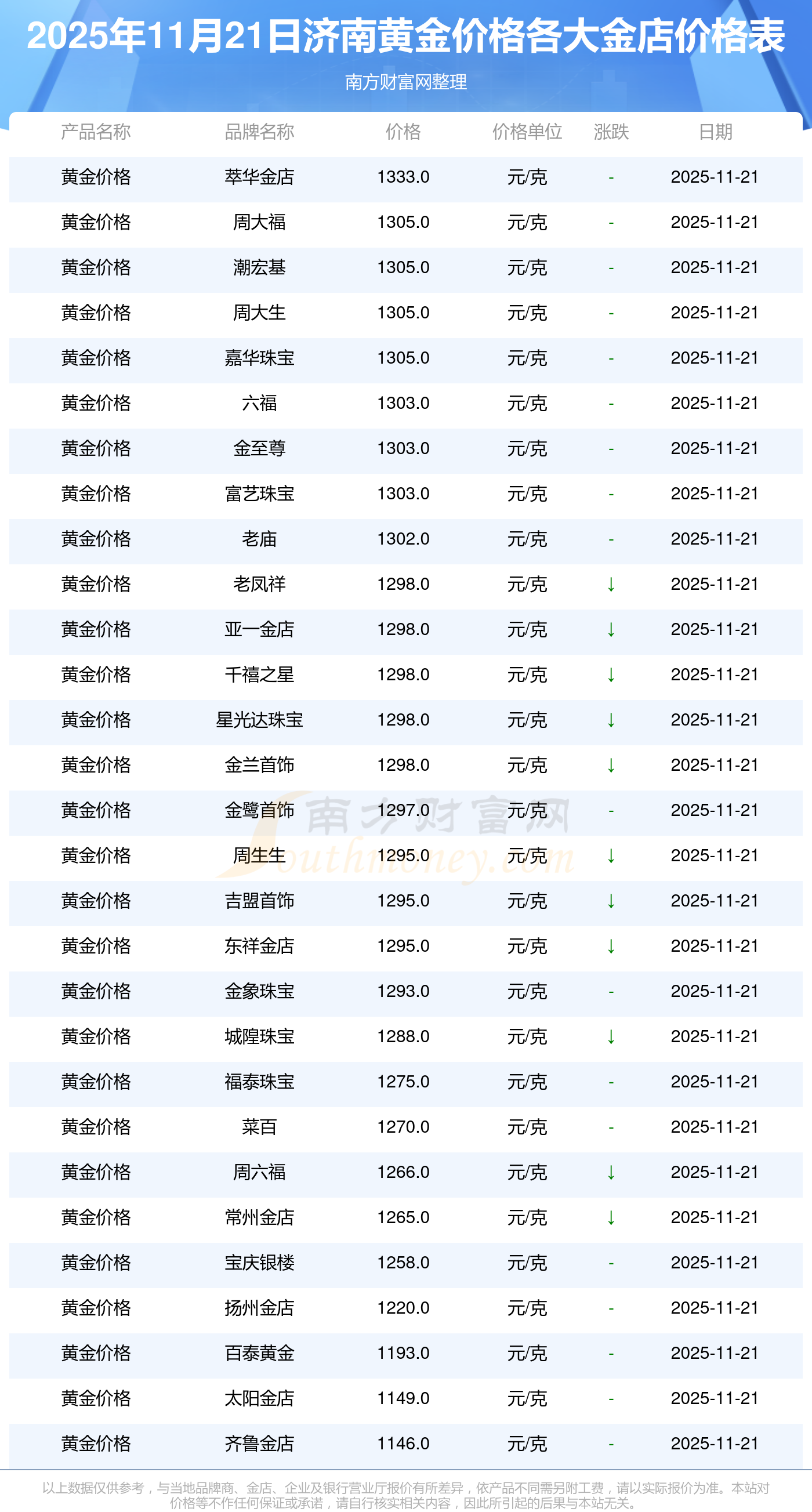今天是2025年11月21日,济南周大福、周大福、周大福、周大福、周大福、周大福、周大福、老凤祥、老凤祥、老凤祥、周六福等各大金店品牌黄金价格最新价格如下:周大福1305.0元/克、周大福616.0元/克、周大福1305.0元/克、周大福45110.0、周大福17570.0、周大福40690.0、周大福1143.0元/克、老凤祥1298.0元/克、老凤祥600.0元/克、老凤祥1298.0元/克、周六福1266.0元/克。