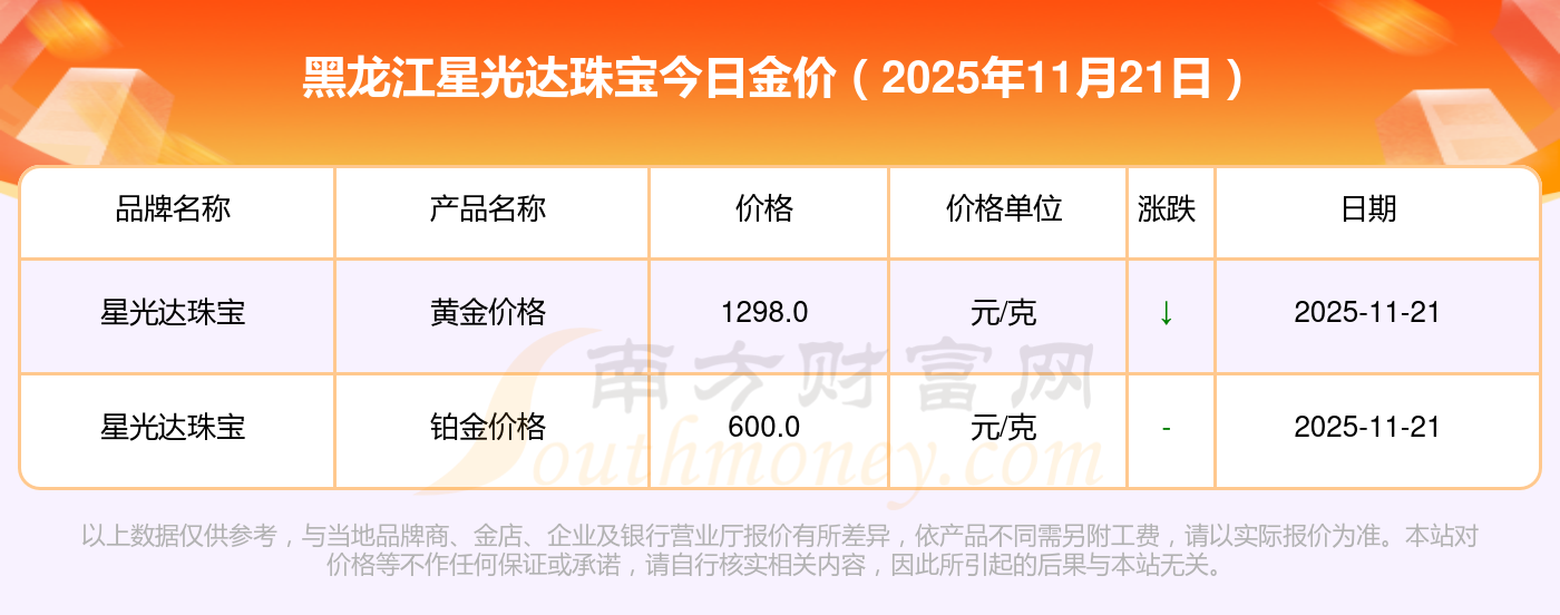 黑龙江星光达珠宝金价今日价格:黄金价格1305.0元/克,铂金价格616.0元/克,饰品金价(内地)1305.0元/克,黄金饰品(香港)45110.0,铂金价格(香港)17570.0,金条价格(香港)40690.0,金条金价(内地)1143.0元/克,黄金价格1298.0元/克,铂金价格600.0元/克,足金价格1298.0元/克,黄金价格1266.0元/克。