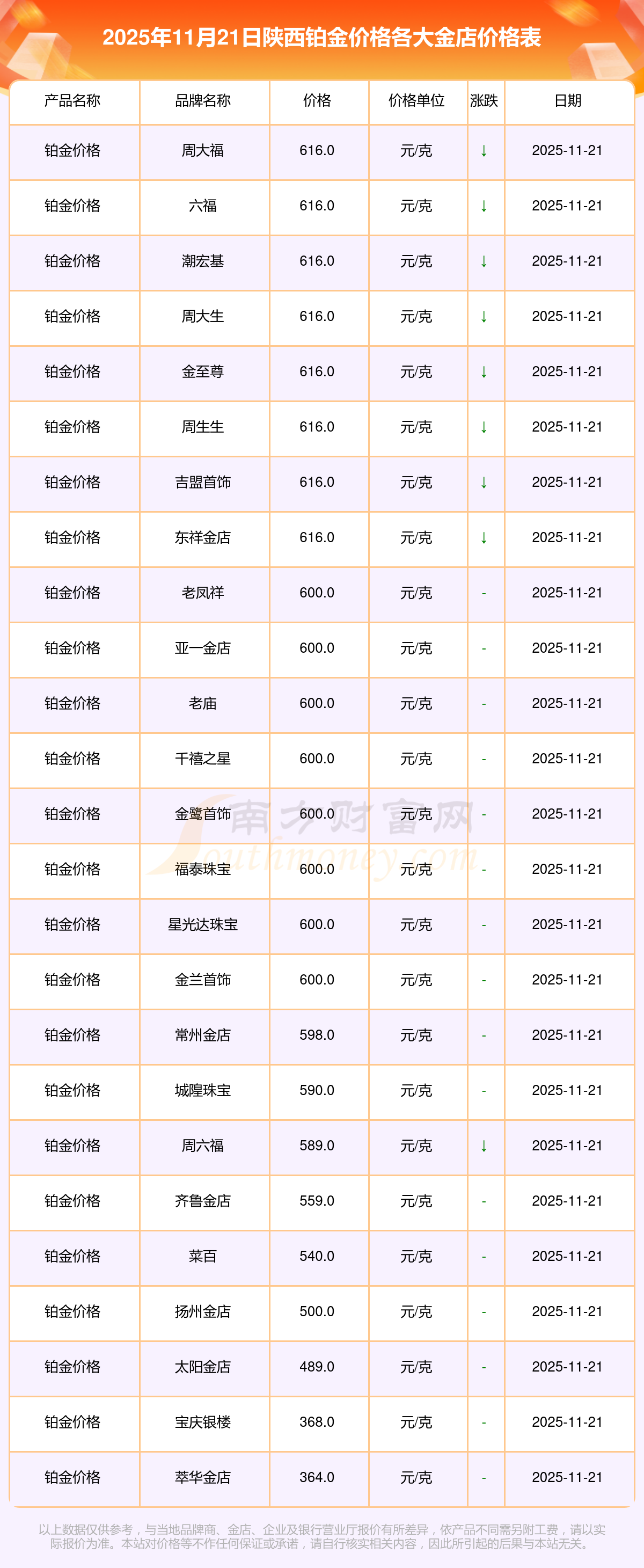 2025年11月21日,陕西周大福、周大福、周大福、周大福、周大福、周大福、周大福、老凤祥、老凤祥、老凤祥、周六福等各大金店品牌铂金价格今日价格如下:周大福1305.0元/克、周大福616.0元/克、周大福1305.0元/克、周大福45110.0、周大福17570.0、周大福40690.0、周大福1143.0元/克、老凤祥1298.0元/克、老凤祥600.0元/克、老凤祥1298.0元/克、周六福1266.0元/克。
