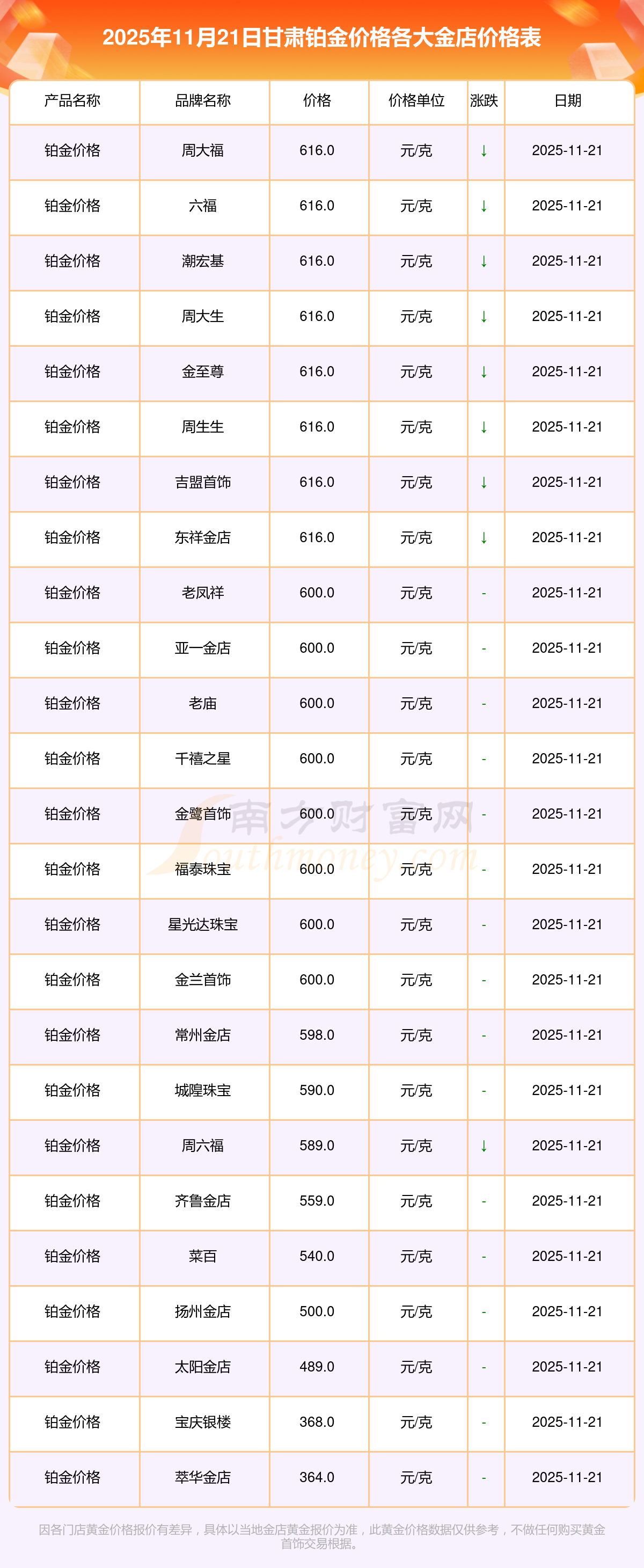 一、2025年11月21日甘肃各品牌金店实时铂金价格表