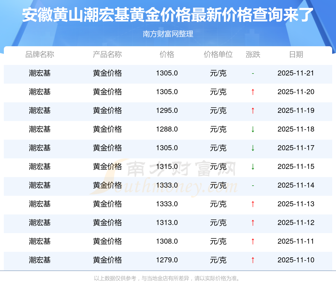 2025年11月21日安徽黄山潮宏基黄金价格为1305.0元/克。