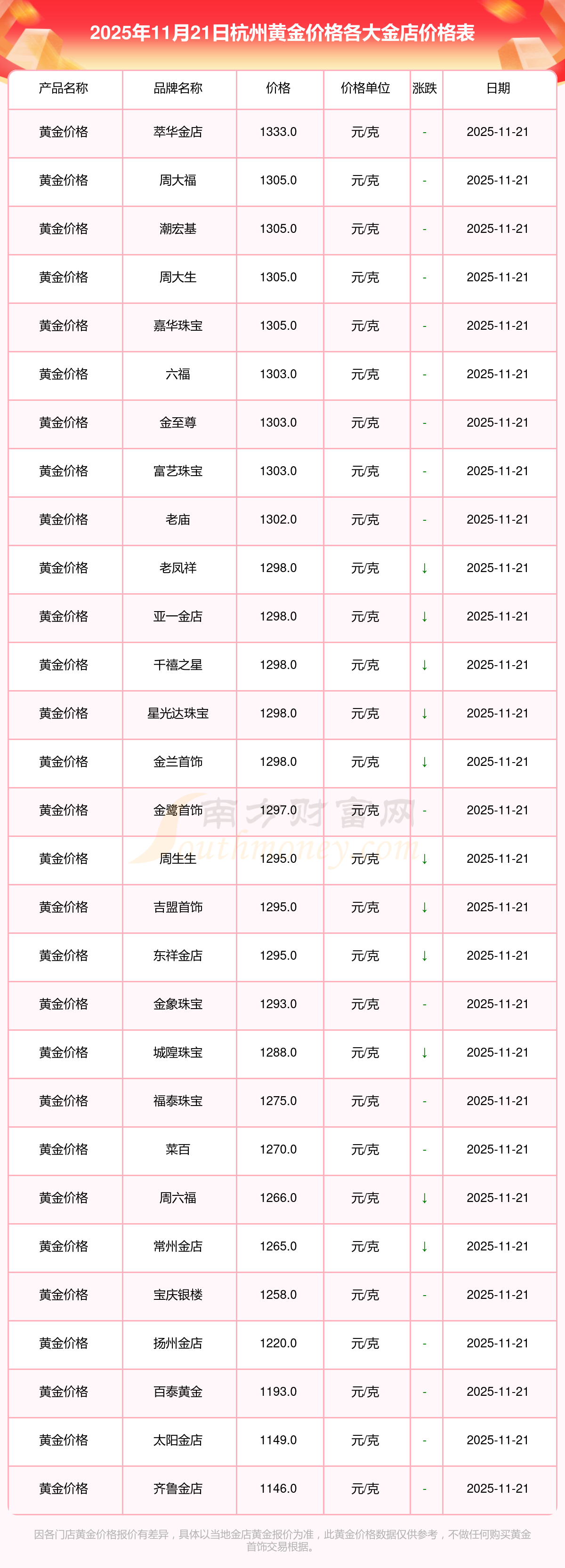 2025年11月21日杭州周大福、周大福、周大福、周大福、周大福、周大福、周大福、老凤祥、老凤祥、老凤祥、周六福等各大金店品牌黄金价格最新价格如下:周大福黄金价格1305.0元/克,周大福铂金价格616.0元/克,周大福饰品金价(内地)1305.0元/克,周大福黄金饰品(香港)45110.0,周大福铂金价格(香港)17570.0,周大福金条价格(香港)40690.0,周大福金条金价(内地)1143.0元/克,老凤祥黄金价格1298.0元/克,老凤祥铂金价格600.0元/克,老凤祥足金价格1298.0元/克,周六福黄金价格1266.0元/克。