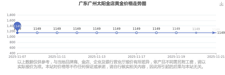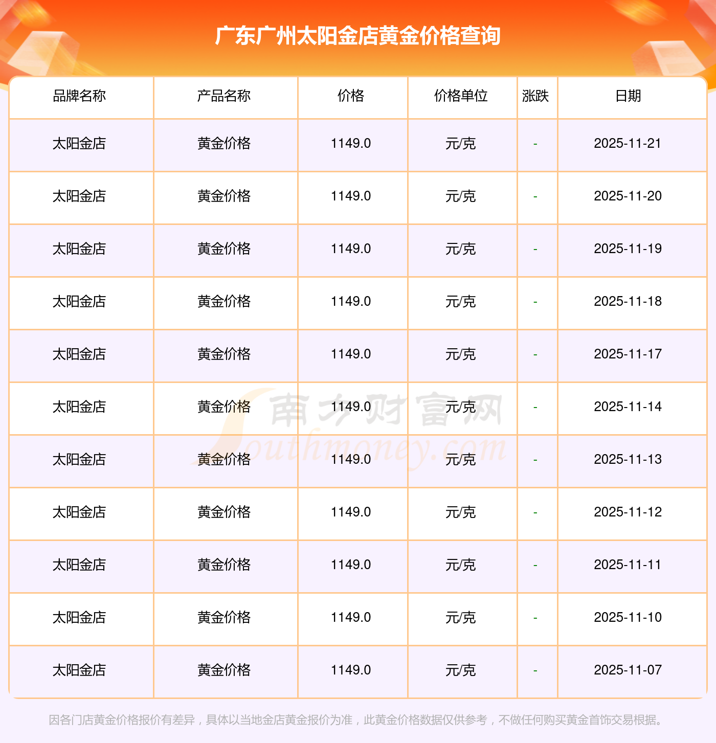 今日广东广州太阳金店黄金价格的价格为1149.0元/克。