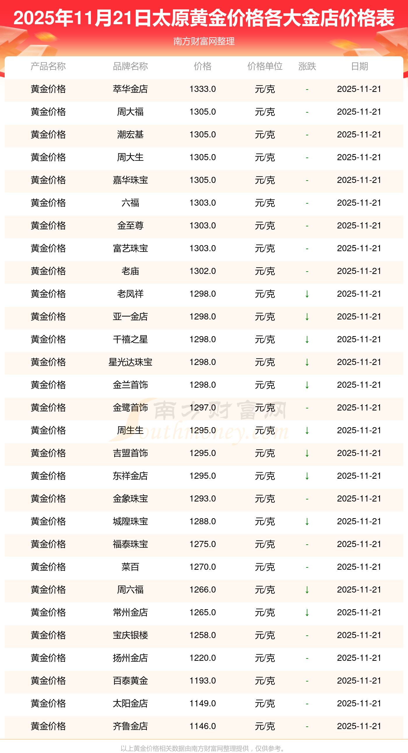 今天是2025年11月21日,太原周大福、周大福、周大福、周大福、周大福、周大福、周大福、老凤祥、老凤祥、老凤祥、周六福等各大金店品牌黄金价格最新价格如下:周大福1305.0元/克、周大福616.0元/克、周大福1305.0元/克、周大福45110.0、周大福17570.0、周大福40690.0、周大福1143.0元/克、老凤祥1298.0元/克、老凤祥600.0元/克、老凤祥1298.0元/克、周六福1266.0元/克。