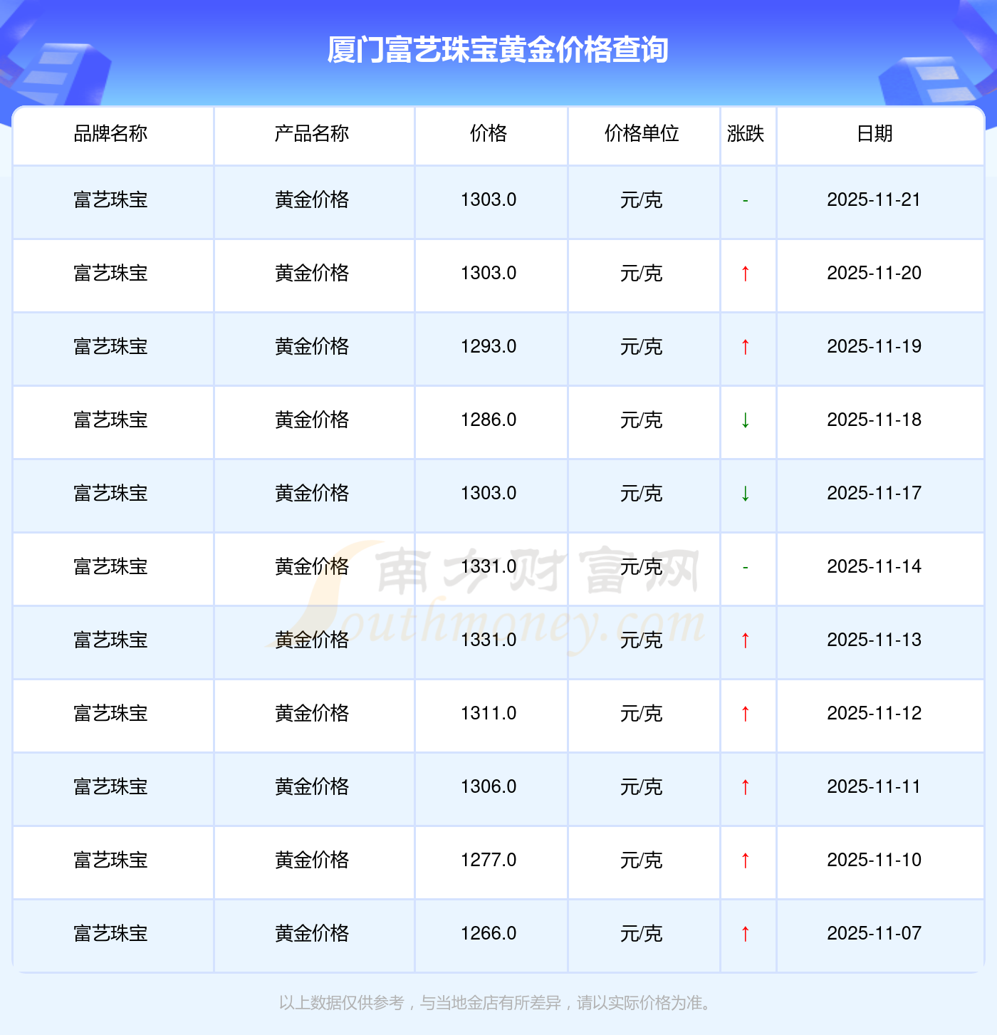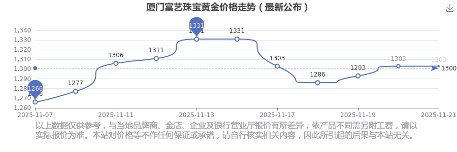 2025年11月21日厦门富艺珠宝黄金价格为1303.0元/克。