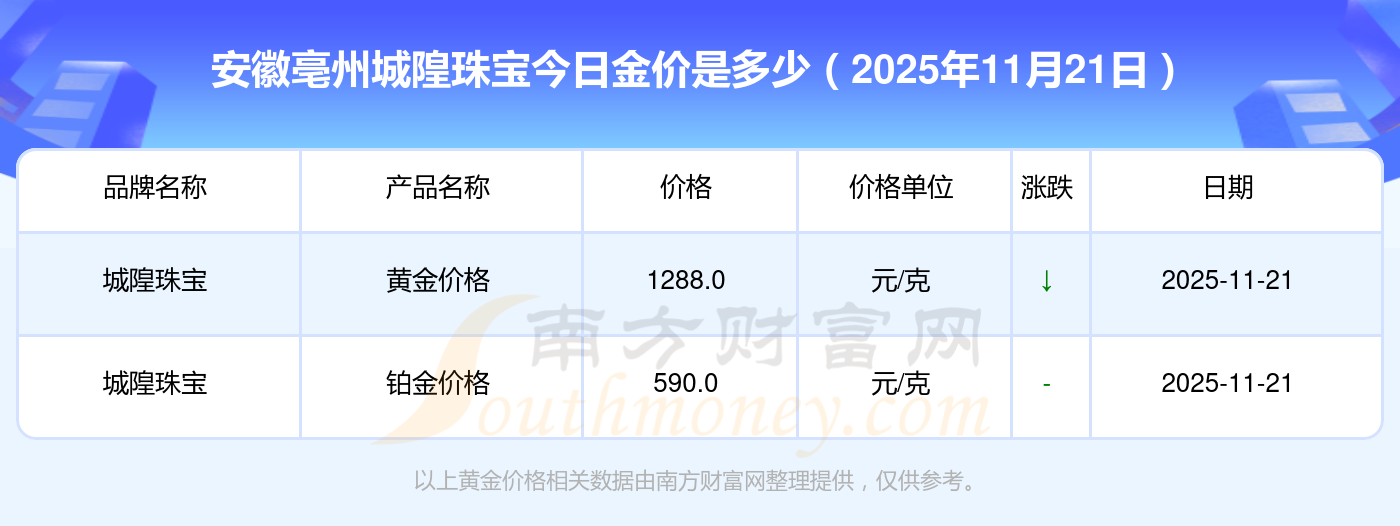 2025年11月21日安徽亳州城隍珠宝黄金的单价,一克为多少?黄金价格1305.0元/克,铂金价格616.0元/克,饰品金价(内地)1305.0元/克,黄金饰品(香港)45110.0,铂金价格(香港)17570.0,金条价格(香港)40690.0,金条金价(内地)1143.0元/克,黄金价格1298.0元/克,铂金价格600.0元/克,足金价格1298.0元/克,黄金价格1266.0元/克。