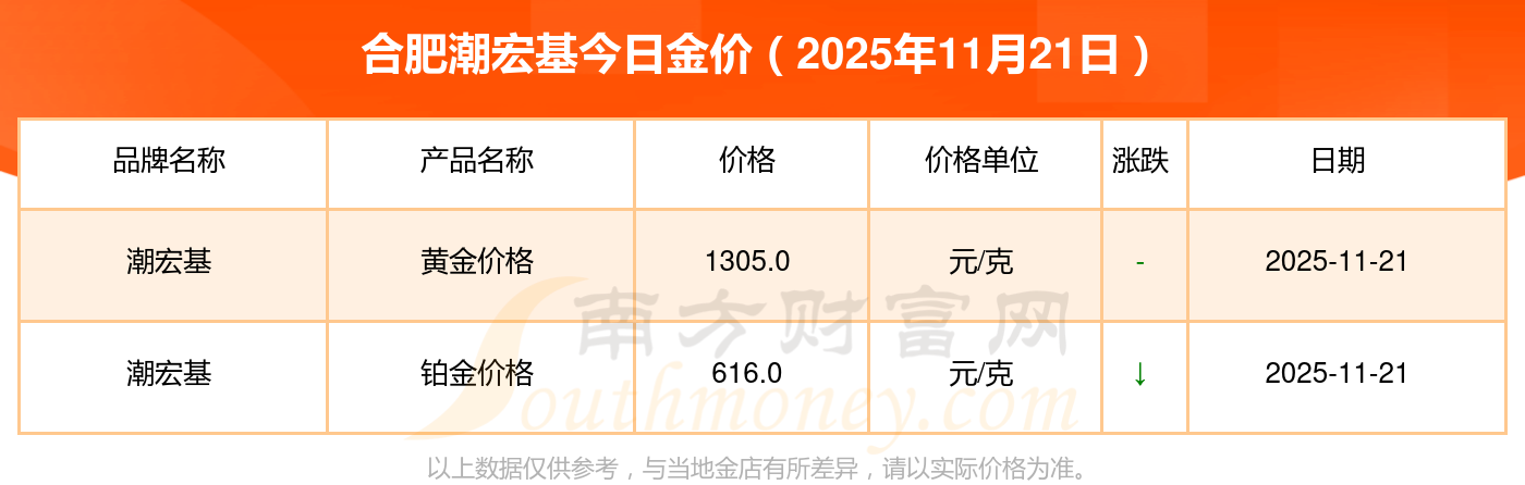 今日黄金价格查询_现在金价黄金一克多少钱,黄金价格是多少钱一克?2025年11月21日合肥潮宏基黄金的单价,一克为多少?黄金价格1305.0元/克,铂金价格616.0元/克,饰品金价(内地)1305.0元/克,黄金饰品(香港)45110.0,铂金价格(香港)17570.0,金条价格(香港)40690.0,金条金价(内地)1143.0元/克,黄金价格1298.0元/克,铂金价格600.0元/克,足金价格1298.0元/克,黄金价格1266.0元/克。