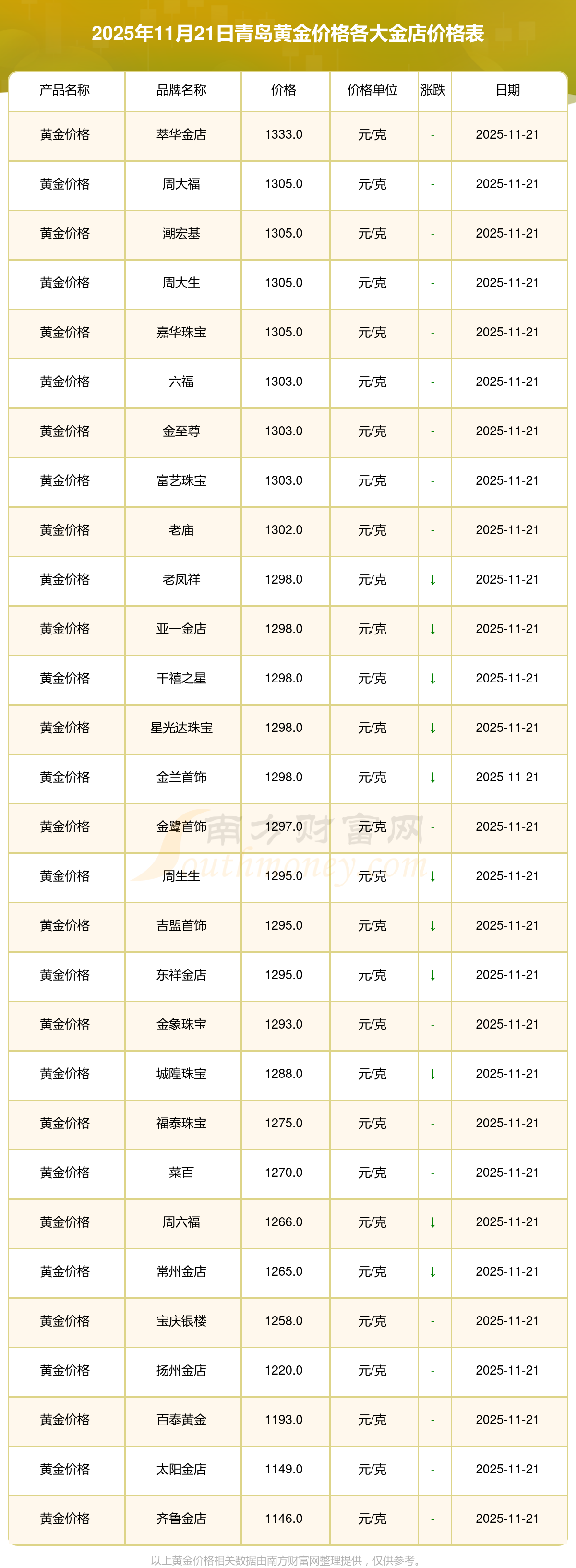 2025年11月21日青岛各大金店黄金价格最新价格查询来了:周大福1305.0元/克,周大福616.0元/克,周大福1305.0元/克,周大福45110.0,周大福17570.0,周大福40690.0,周大福1143.0元/克,老凤祥1298.0元/克,老凤祥600.0元/克,老凤祥1298.0元/克,周六福1266.0元/克。