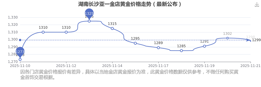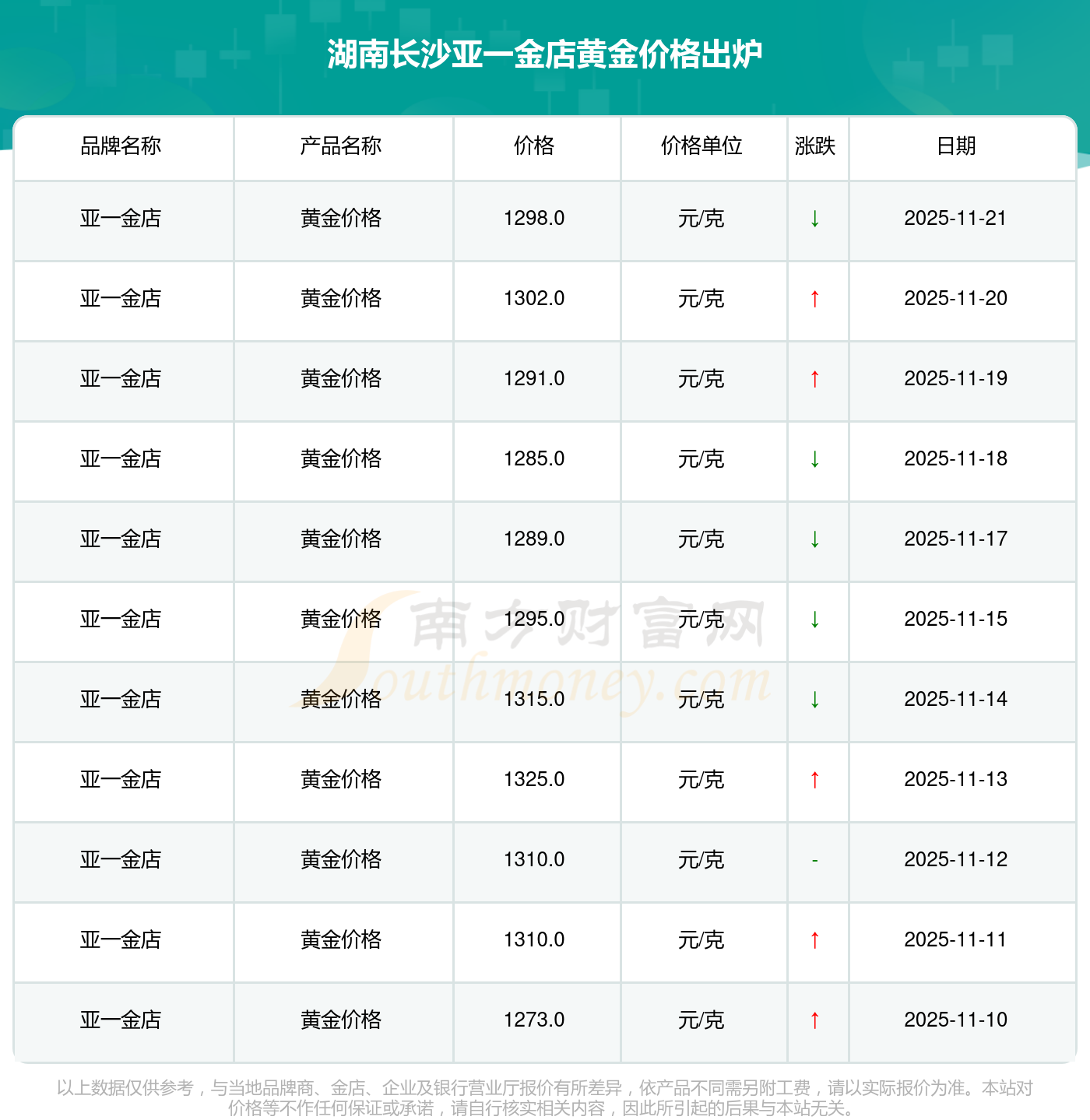 今日(2025年11月21日),湖南长沙亚一金店黄金价格每克的价值为1298.0元/克。