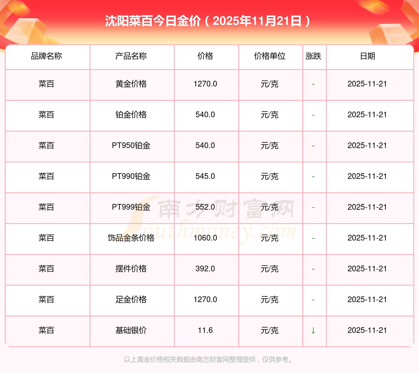 2025年11月21日沈阳菜百最新价格:黄金价格1305.0元/克,铂金价格616.0元/克,饰品金价(内地)1305.0元/克,黄金饰品(香港)45110.0,铂金价格(香港)17570.0,金条价格(香港)40690.0,金条金价(内地)1143.0元/克,黄金价格1298.0元/克,铂金价格600.0元/克,足金价格1298.0元/克,黄金价格1266.0元/克。
