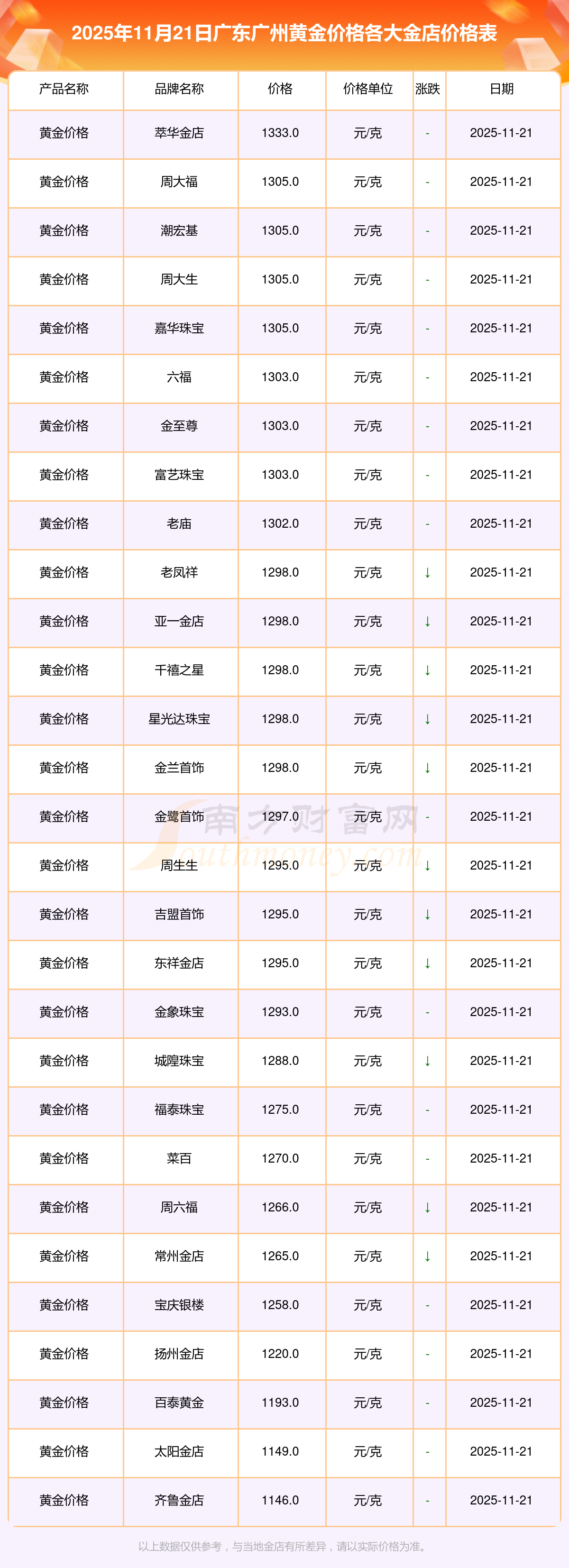以上数据仅供参考,与当地金店有所差异,请以实际价格为准。
