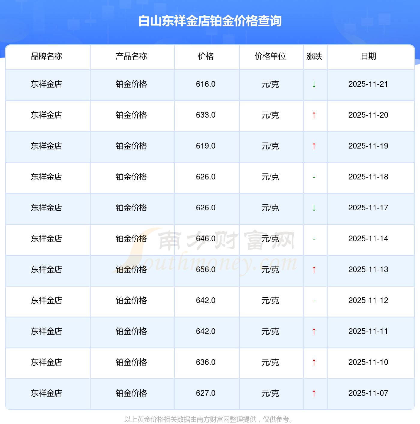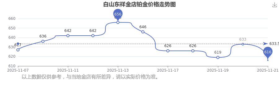 今日白山东祥金店铂金价格为616.0元/克。