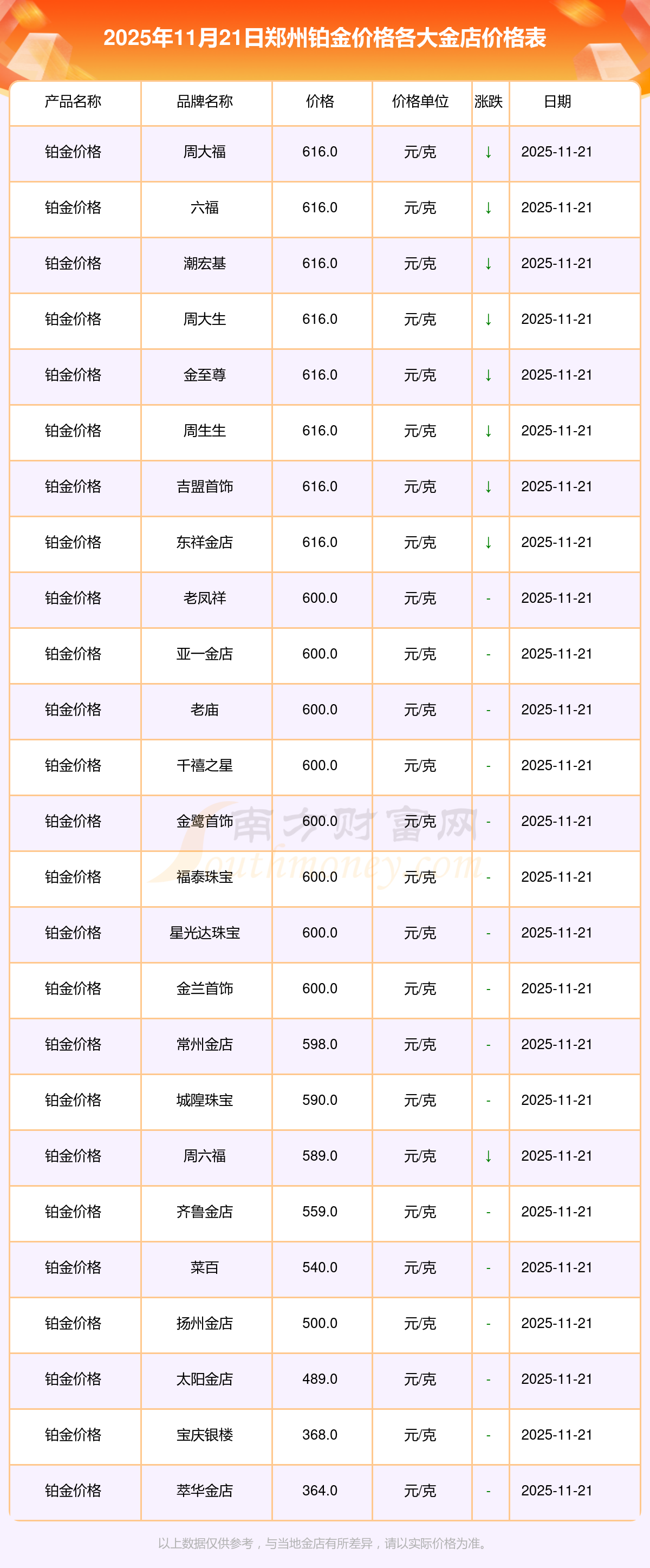 2025年11月21日郑州各大金店铂金价格最新价格:周大福1305.0元/克,周大福616.0元/克,周大福1305.0元/克,周大福45110.0,周大福17570.0,周大福40690.0,周大福1143.0元/克,老凤祥1298.0元/克,老凤祥600.0元/克,老凤祥1298.0元/克,周六福1266.0元/克。