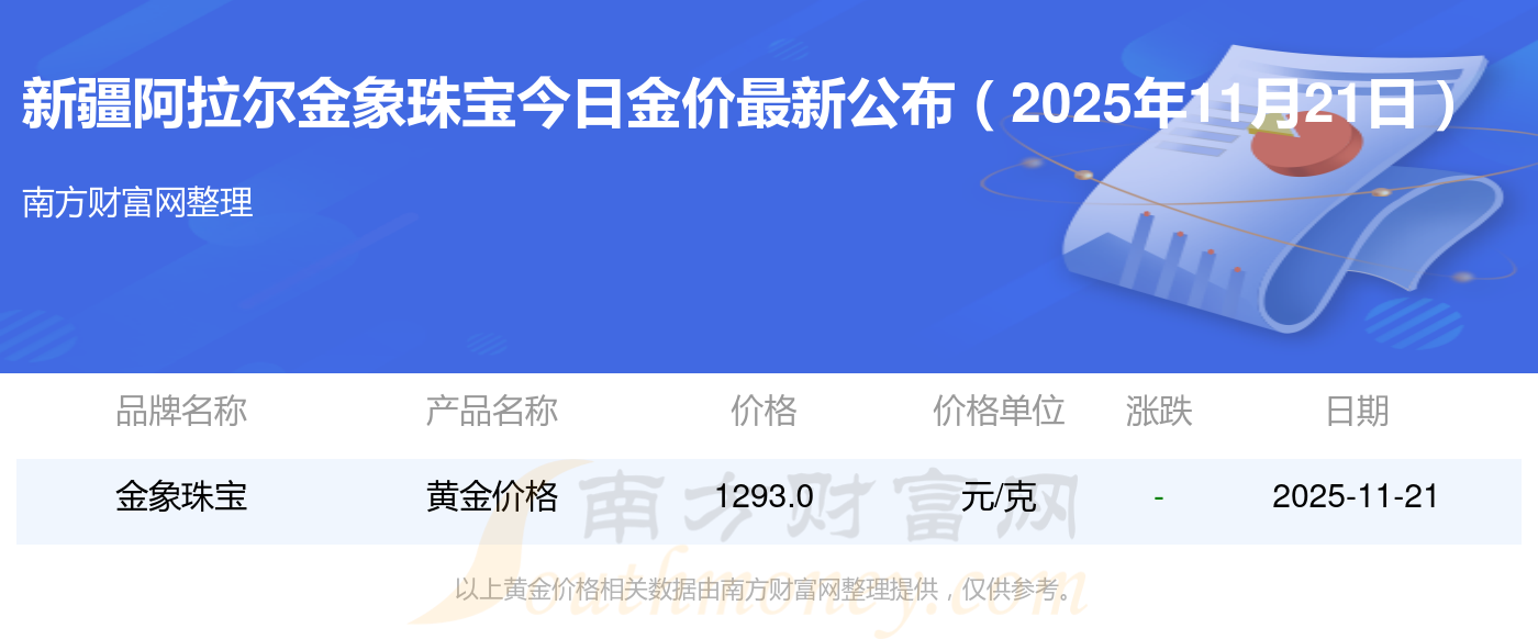 今日黄金价格查询_现在金价黄金一克多少钱,黄金价格是多少钱一克?2025年11月21日新疆阿拉尔金象珠宝每克黄金的市场价格是多少:黄金价格1305.0元/克,铂金价格616.0元/克,饰品金价(内地)1305.0元/克,黄金饰品(香港)45110.0,铂金价格(香港)17570.0,金条价格(香港)40690.0,金条金价(内地)1143.0元/克,黄金价格1298.0元/克,铂金价格600.0元/克,足金价格1298.0元/克,黄金价格1266.0元/克。