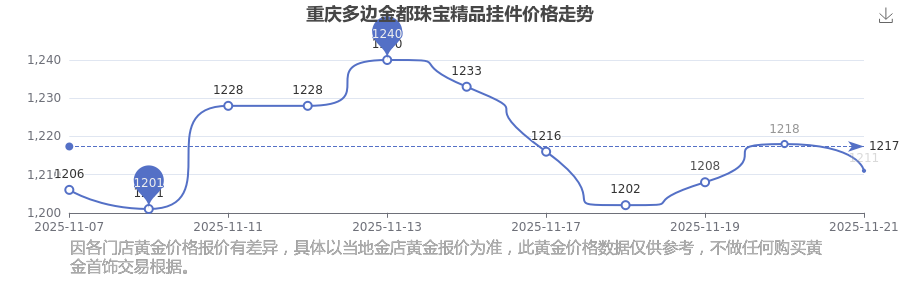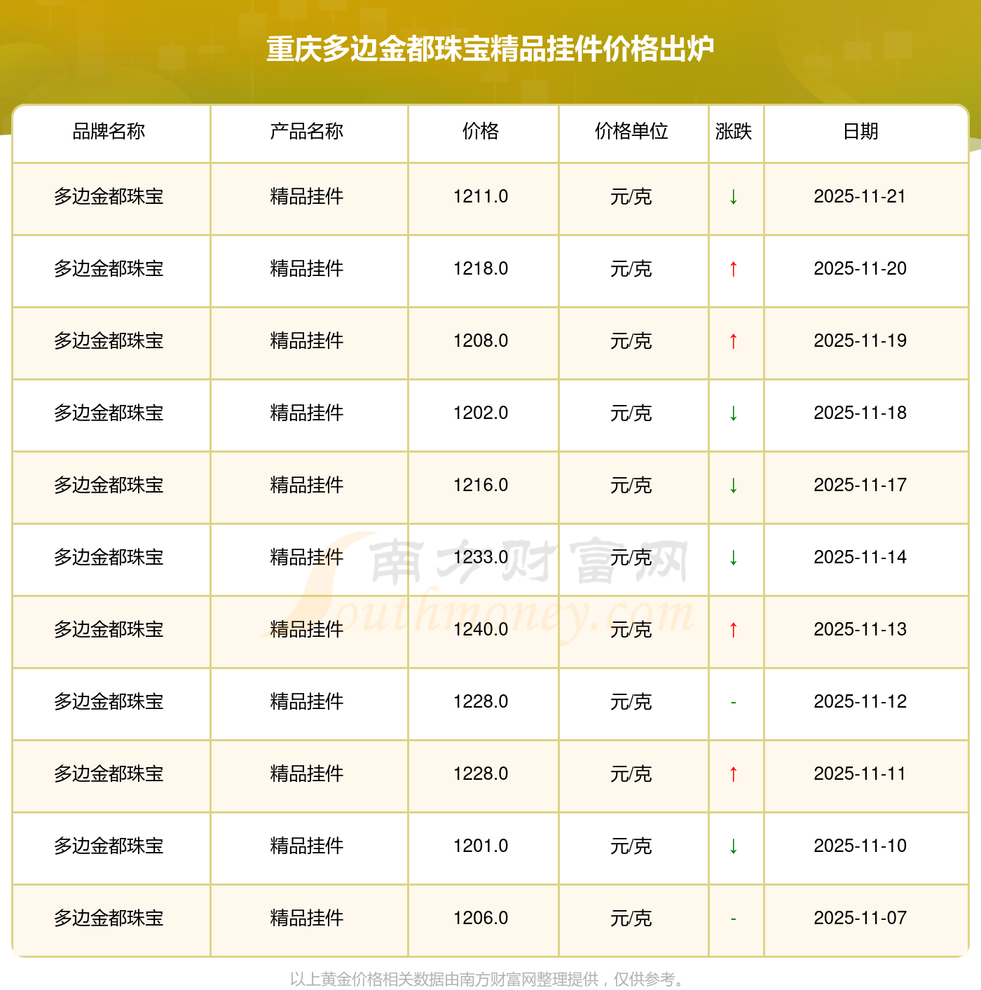 重庆多边金都珠宝精品挂件价格在 2025年11月21日为 1211.0元/克。