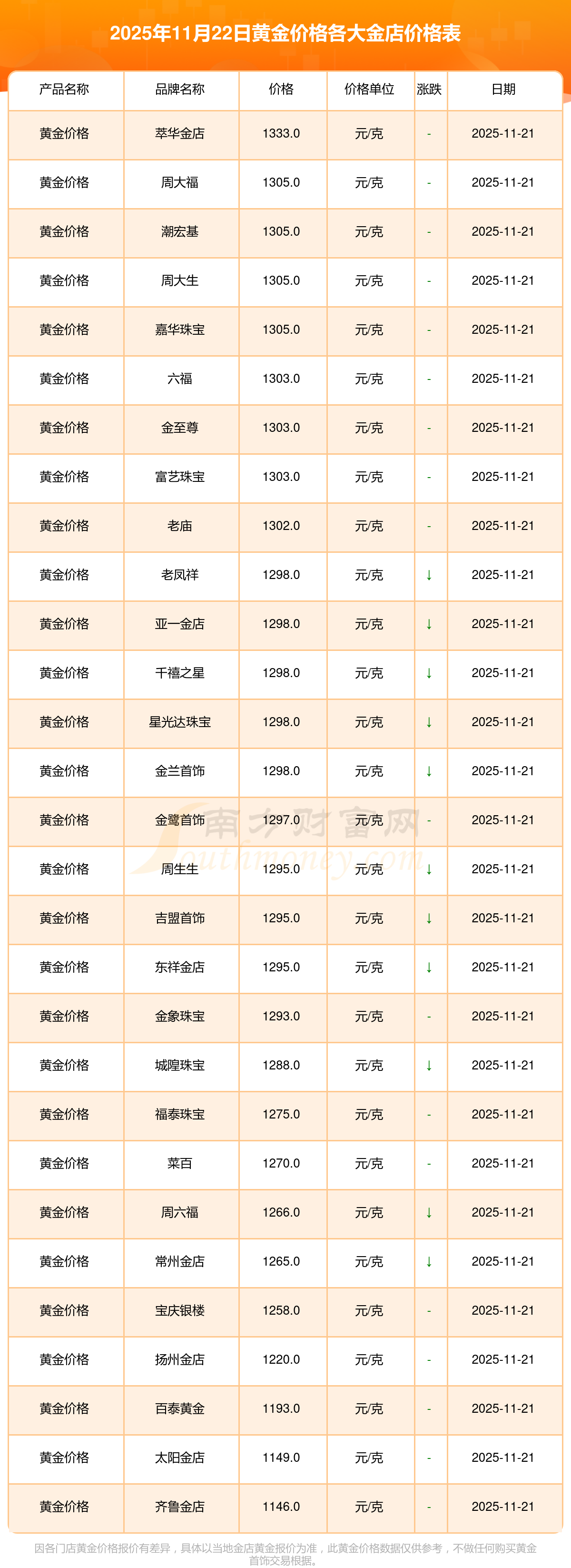 2025年11月22日,周大福、周大福、周大福、周大福、周大福、周大福、周大福、老凤祥、老凤祥、老凤祥、周六福等各大金店品牌黄金价格今日价格如下:周大福1305.0元/克、周大福616.0元/克、周大福1305.0元/克、周大福45110.0、周大福17570.0、周大福40690.0、周大福1143.0元/克、老凤祥1298.0元/克、老凤祥600.0元/克、老凤祥1298.0元/克、周六福1266.0元/克。