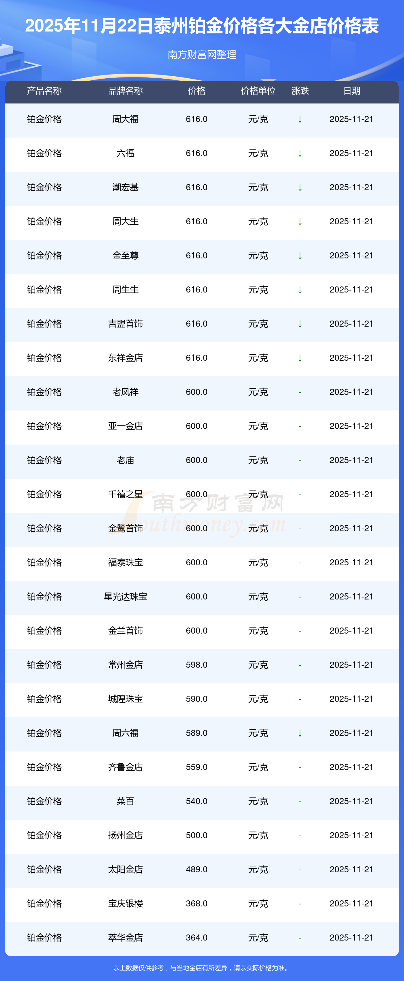 2025年11月22日泰州各大金店铂金价格最新价格查询来了:周大福1305.0元/克,周大福616.0元/克,周大福1305.0元/克,周大福45110.0,周大福17570.0,周大福40690.0,周大福1143.0元/克,老凤祥1298.0元/克,老凤祥600.0元/克,老凤祥1298.0元/克,周六福1266.0元/克。