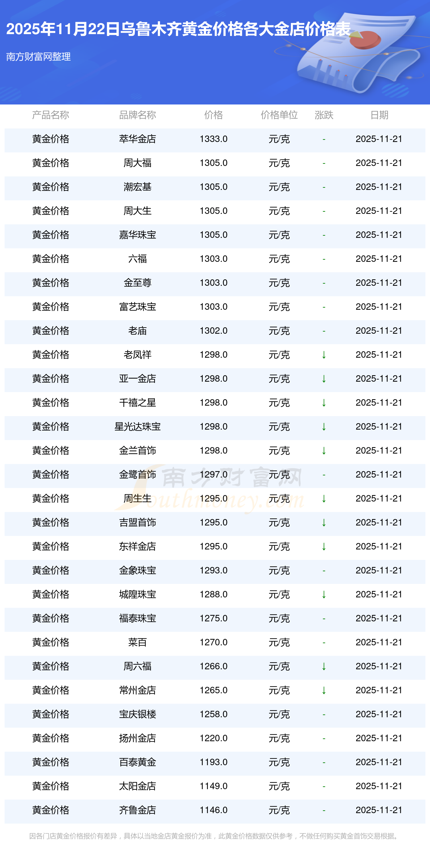 今日乌鲁木齐黄金价格最高的金店是萃华金店,报价1333.0元/克,黄金价格最低的金店是齐鲁金店,报价1146.0元/克。今日黄金价格高低差为187元/克。