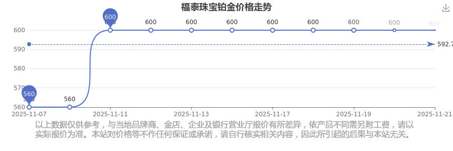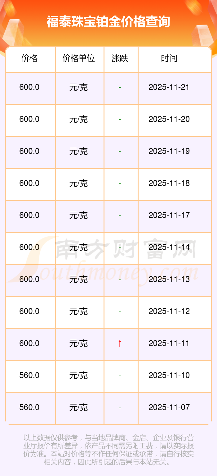 最新数据表明,福泰珠宝今日 铂金价格为600.0元/克。