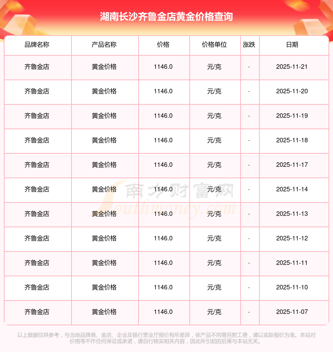 湖南长沙齐鲁金店今日黄金价格最新公布(当下购买一克黄金的价格是多少)?今日湖南长沙齐鲁金店黄金价格查询,今日(2025年11月22日),湖南长沙齐鲁金店黄金价格的定价为 1146.0元/克。