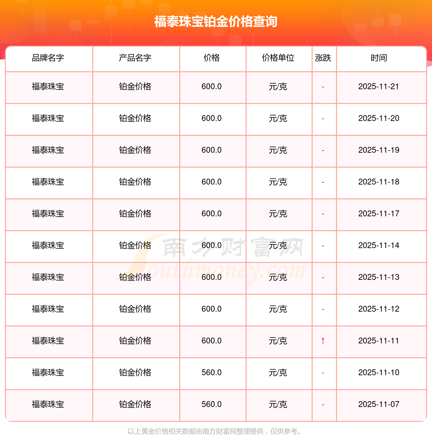 据了解,福泰珠宝今日铂金价格为600.0元/克。