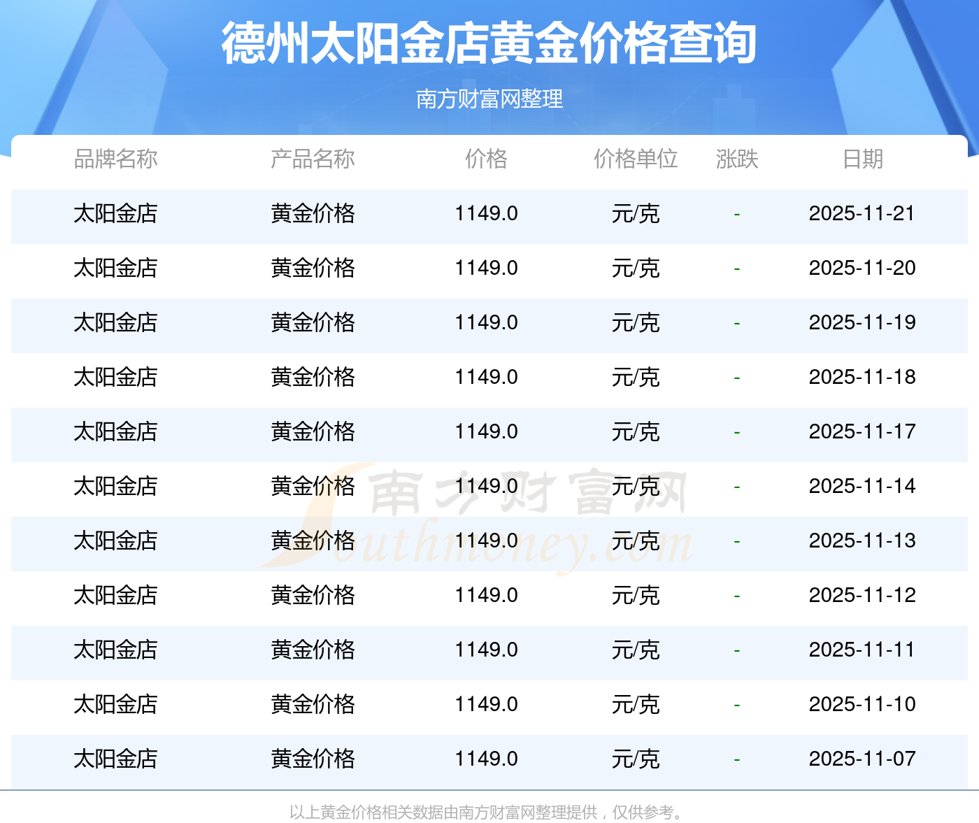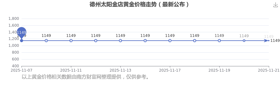今日(2025年11月22日),德州太阳金店黄金价格的定价为 1149.0元/克。