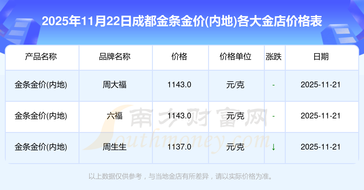 2025年11月22日成都各大金店金条金价(内地)最新价格查询来了:周大福1305.0元/克,周大福616.0元/克,周大福1305.0元/克,周大福45110.0,周大福17570.0,周大福40690.0,周大福1143.0元/克,老凤祥1298.0元/克,老凤祥600.0元/克,老凤祥1298.0元/克,周六福1266.0元/克。