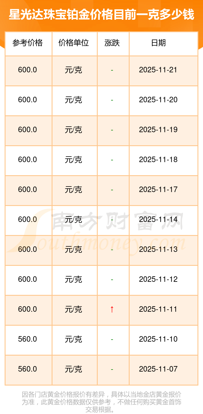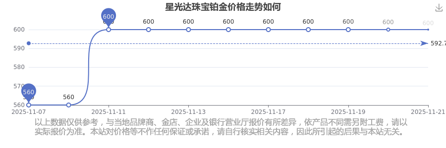今日星光达珠宝铂金价格最新是600.0元/克。