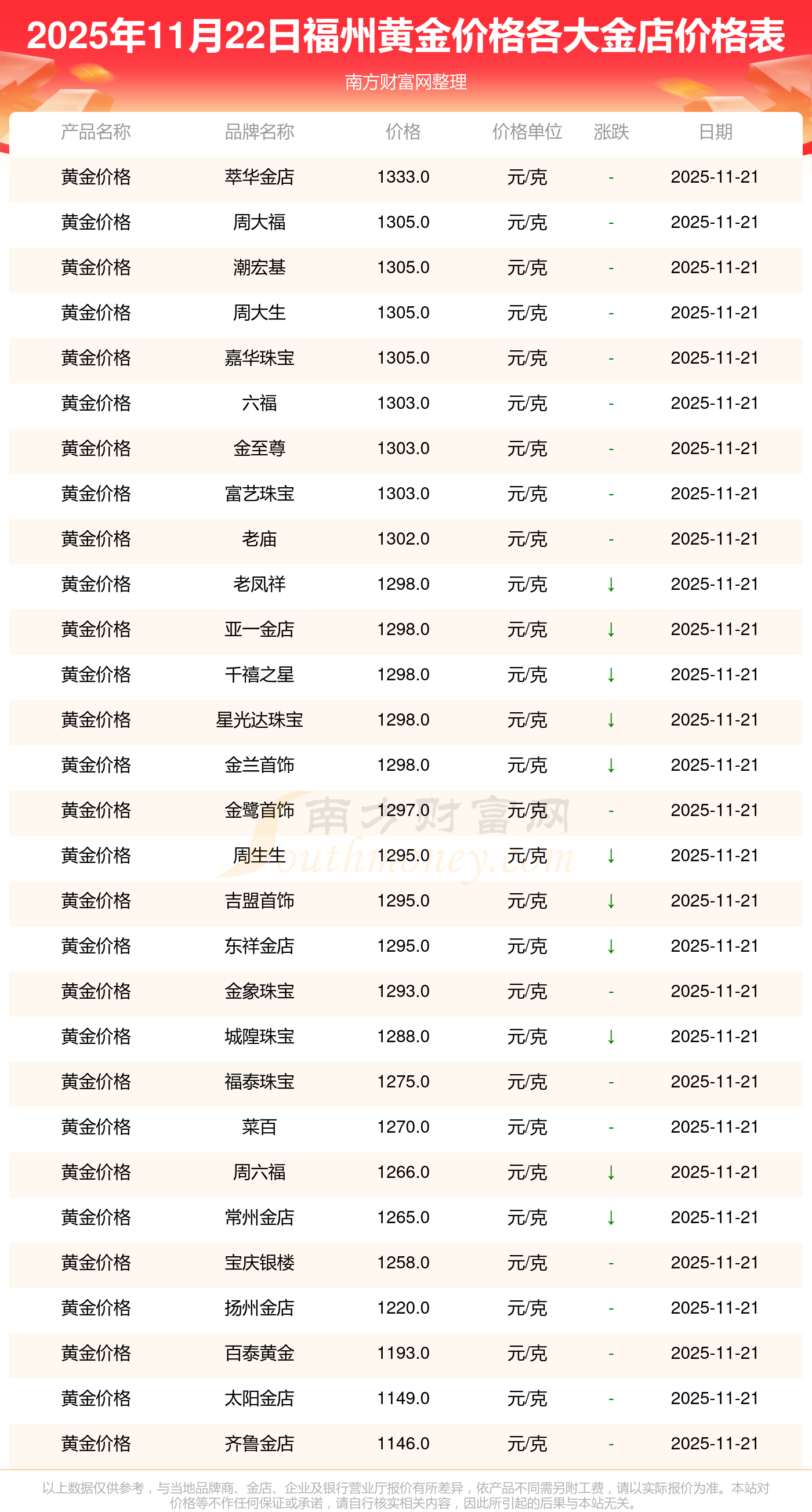 2025年11月22日福州各大金店黄金价格最新价格查询来了:周大福1305.0元/克,周大福616.0元/克,周大福1305.0元/克,周大福45110.0,周大福17570.0,周大福40690.0,周大福1143.0元/克,老凤祥1298.0元/克,老凤祥600.0元/克,老凤祥1298.0元/克,周六福1266.0元/克。