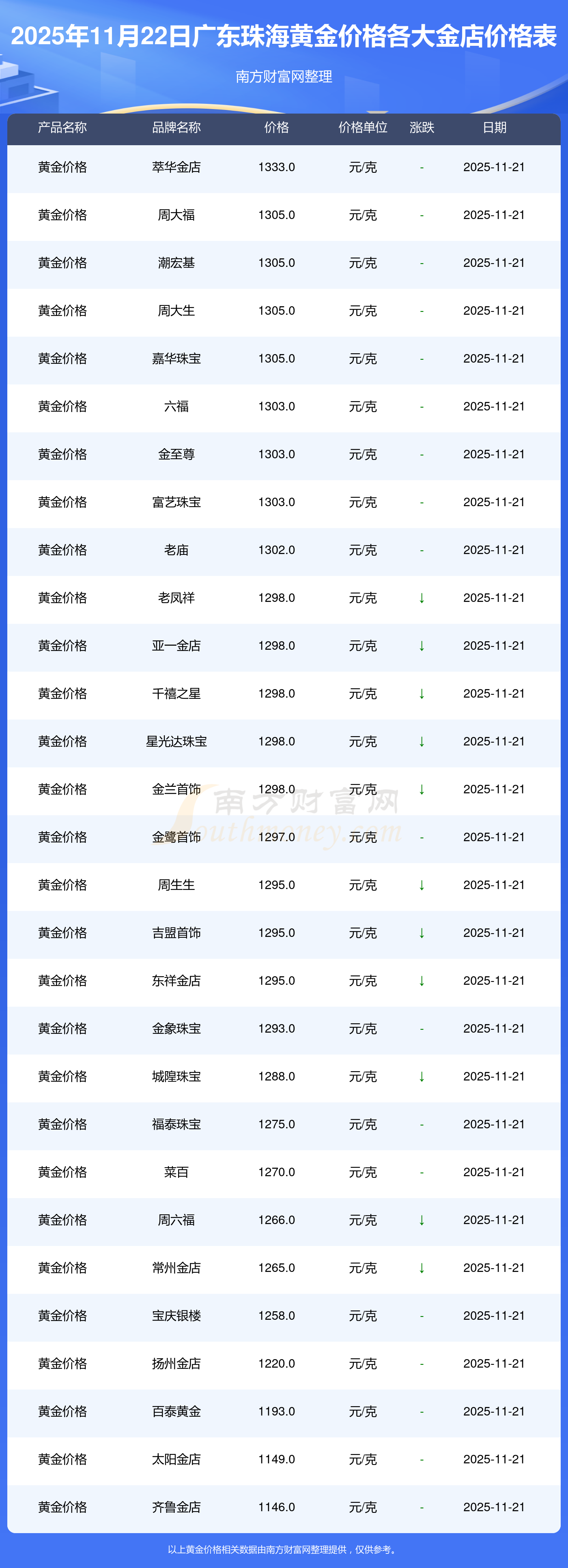 2025年11月22日广东珠海各大金店黄金价格最新价格查询来了:周大福1305.0元/克,周大福616.0元/克,周大福1305.0元/克,周大福45110.0,周大福17570.0,周大福40690.0,周大福1143.0元/克,老凤祥1298.0元/克,老凤祥600.0元/克,老凤祥1298.0元/克,周六福1266.0元/克。