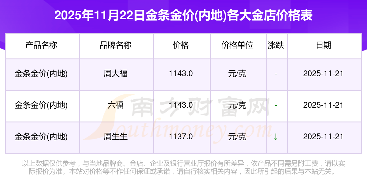 2025年11月22日各大金店金条金价(内地)最新价格:周大福1305.0元/克,周大福616.0元/克,周大福1305.0元/克,周大福45110.0,周大福17570.0,周大福40690.0,周大福1143.0元/克,老凤祥1298.0元/克,老凤祥600.0元/克,老凤祥1298.0元/克,周六福1266.0元/克。