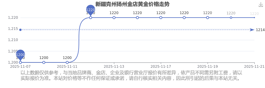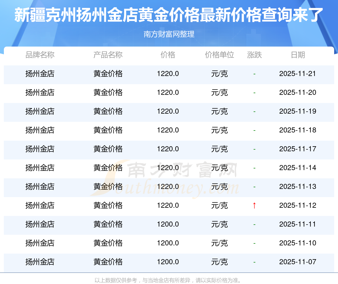 新疆克州扬州金店黄金价格在 2025年11月22日为 1220.0元/克。