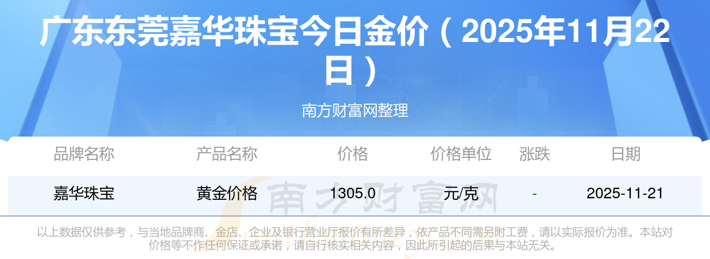 今日黄金价格查询_现在金价黄金一克多少钱,黄金价格是多少钱一克?2025年11月22日广东东莞嘉华珠宝黄金一克的市场行情价是多少?黄金价格1305.0元/克,铂金价格616.0元/克,饰品金价(内地)1305.0元/克,黄金饰品(香港)45110.0,铂金价格(香港)17570.0,金条价格(香港)40690.0,金条金价(内地)1143.0元/克,黄金价格1298.0元/克,铂金价格600.0元/克,足金价格1298.0元/克,黄金价格1266.0元/克。