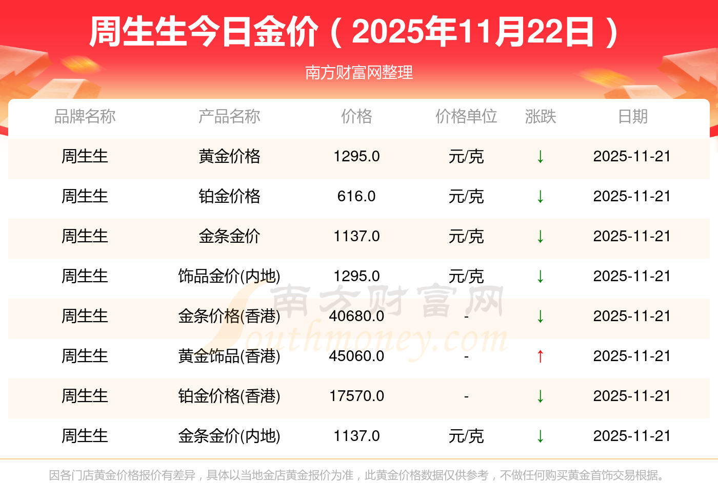 2025年11月22日,周大福、周大福、周大福、周大福、周大福、周大福、周大福、老凤祥、老凤祥、老凤祥、周六福等各大金店品牌黄金价格今日价格如下:周大福1305.0元/克、周大福616.0元/克、周大福1305.0元/克、周大福45110.0、周大福17570.0、周大福40690.0、周大福1143.0元/克、老凤祥1298.0元/克、老凤祥600.0元/克、老凤祥1298.0元/克、周六福1266.0元/克。