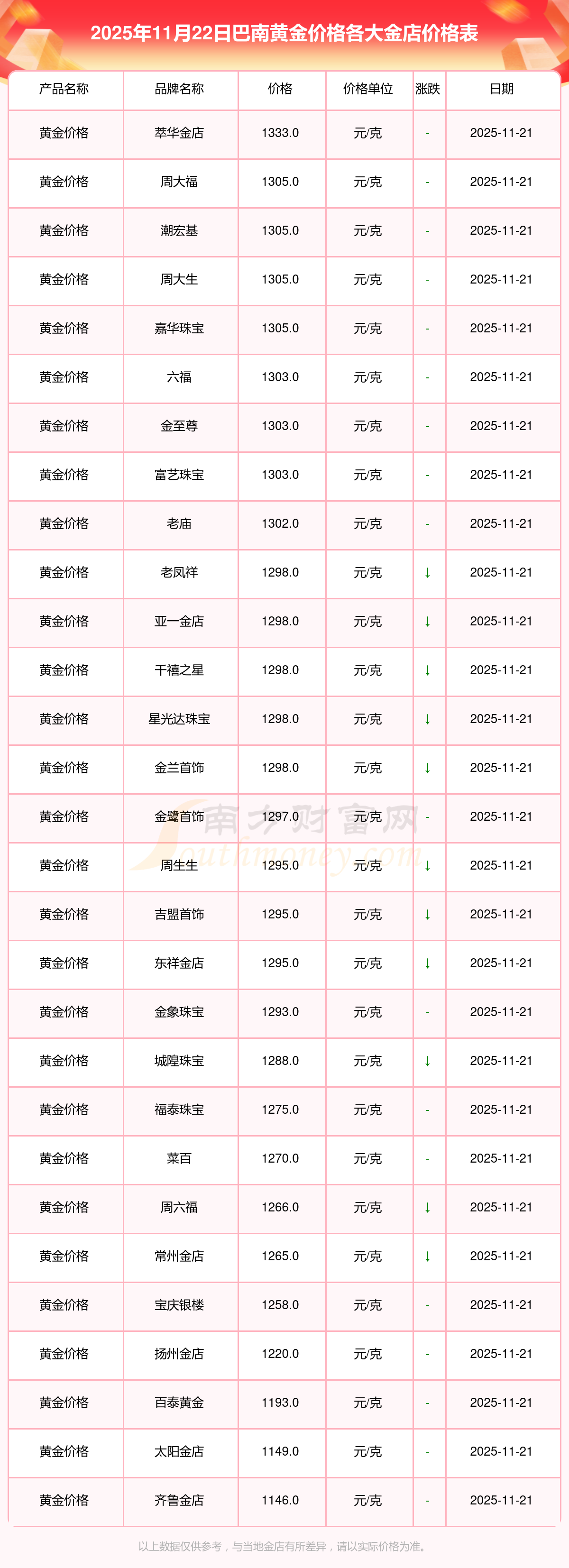 一、2025年11月22日巴南各品牌金店实时黄金价格表