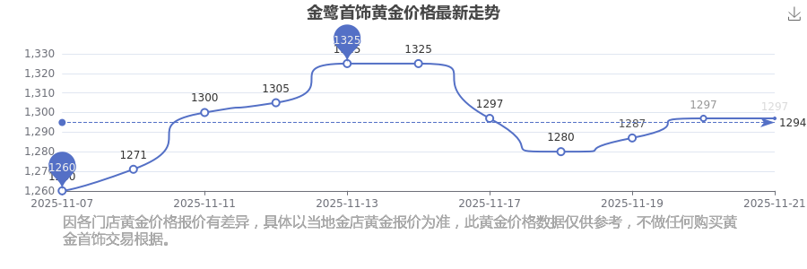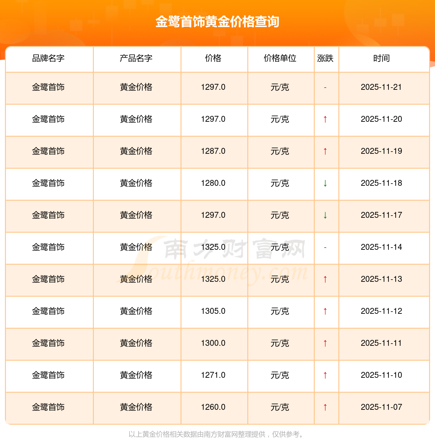 2025年11月22日金鹭首饰黄金价格:1297.0元/克。