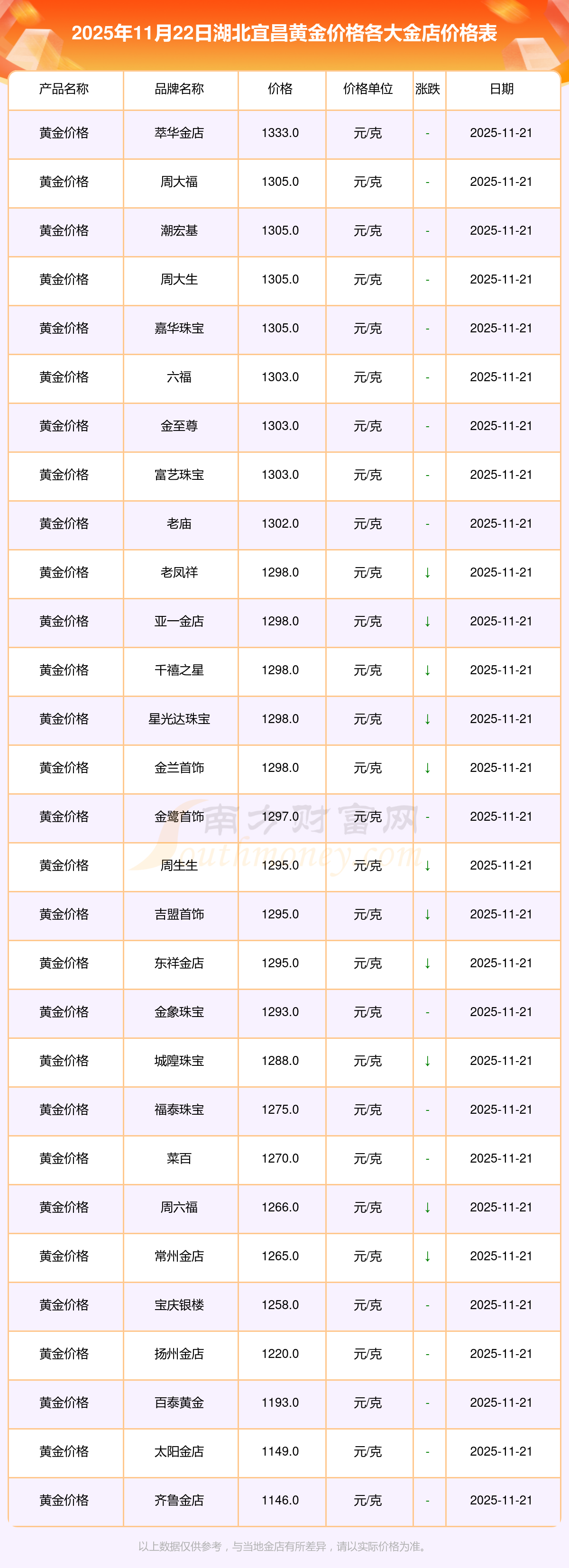 2025年11月22日湖北宜昌各大金店黄金价格最新价格查询来了:周大福1305.0元/克,周大福616.0元/克,周大福1305.0元/克,周大福45110.0,周大福17570.0,周大福40690.0,周大福1143.0元/克,老凤祥1298.0元/克,老凤祥600.0元/克,老凤祥1298.0元/克,周六福1266.0元/克。