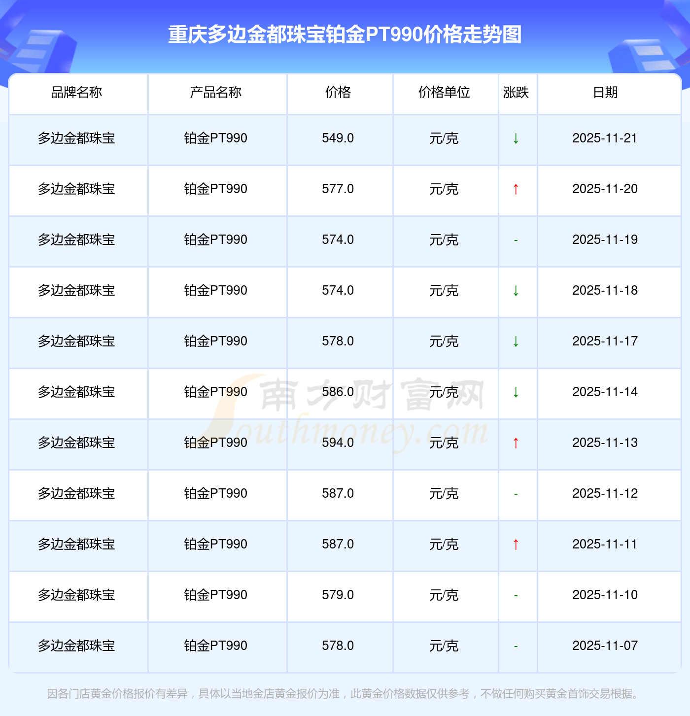 今日重庆多边金都珠宝铂金PT990的价格为549.0元/克。