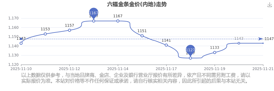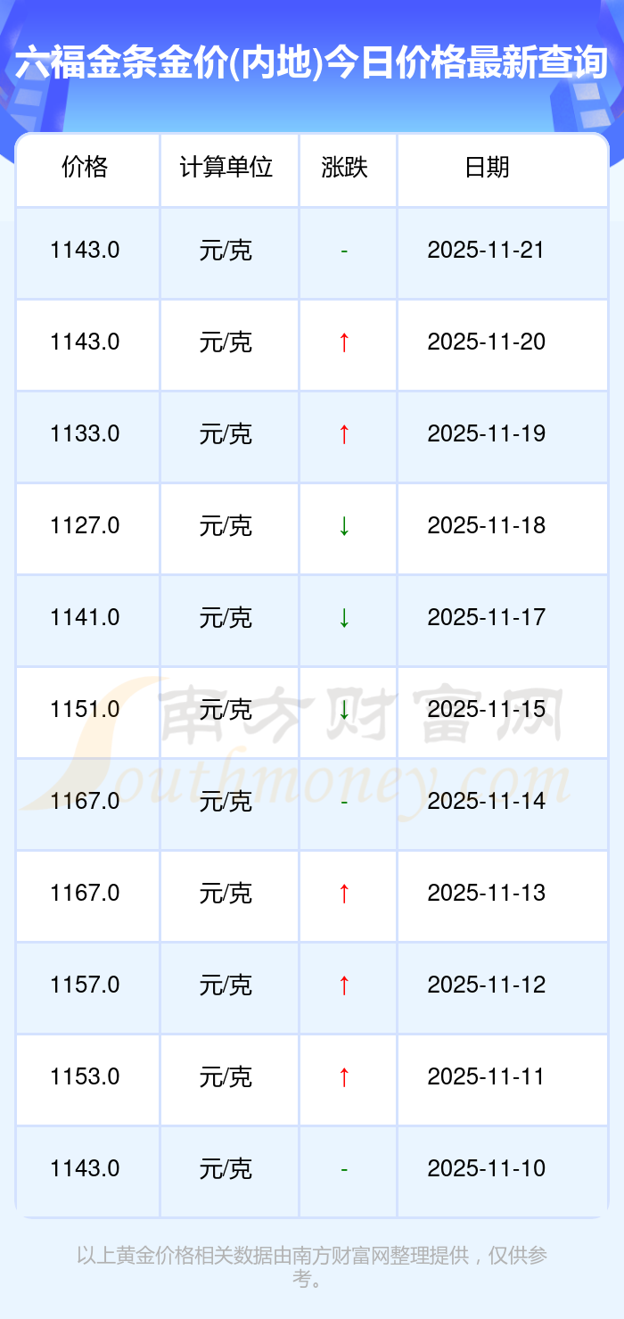 今日(2025年11月22日)六福金条金价(内地)的价格为1143.0元/克。