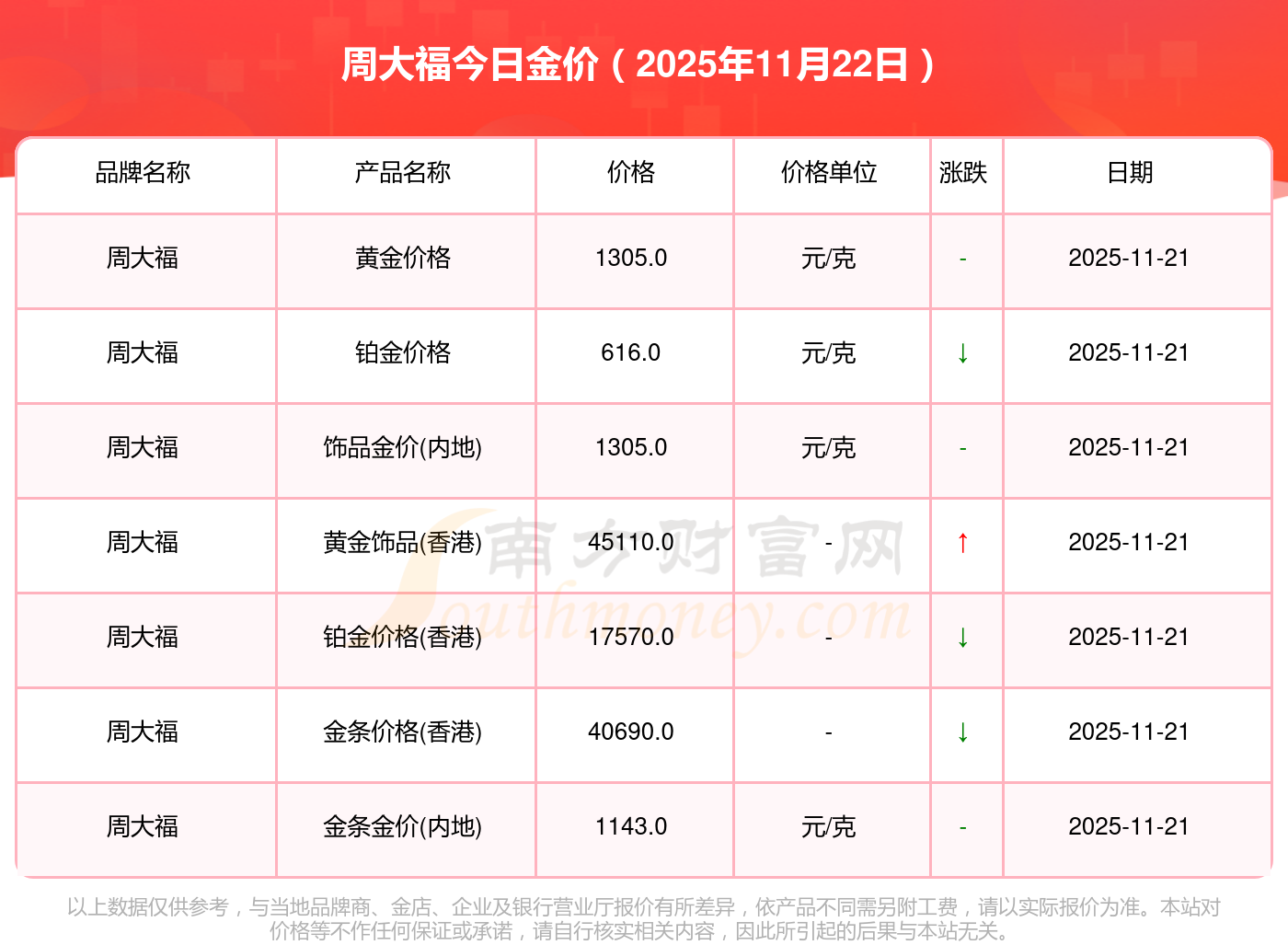 现在周大福黄金价格是多少钱1克_2025年周大福今日金价是多少钱一克,最新周大福查询,2025年11月22日周大福金条金价(内地)现在每克多少钱?最新周大福金条金价(内地)报价公布,一起来看看吧!