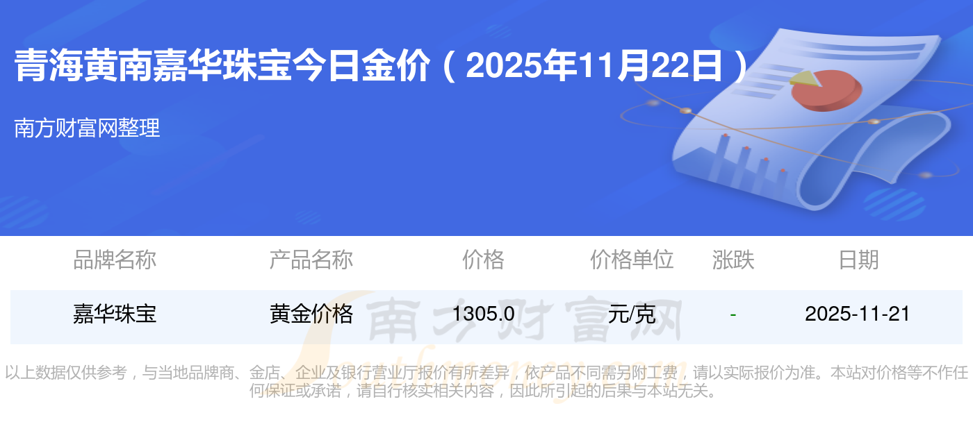 2025年11月22日青海黄南嘉华珠宝金价查询:黄金价格1305.0元/克,铂金价格616.0元/克,饰品金价(内地)1305.0元/克,黄金饰品(香港)45110.0,铂金价格(香港)17570.0,金条价格(香港)40690.0,金条金价(内地)1143.0元/克,黄金价格1298.0元/克,铂金价格600.0元/克,足金价格1298.0元/克,黄金价格1266.0元/克。