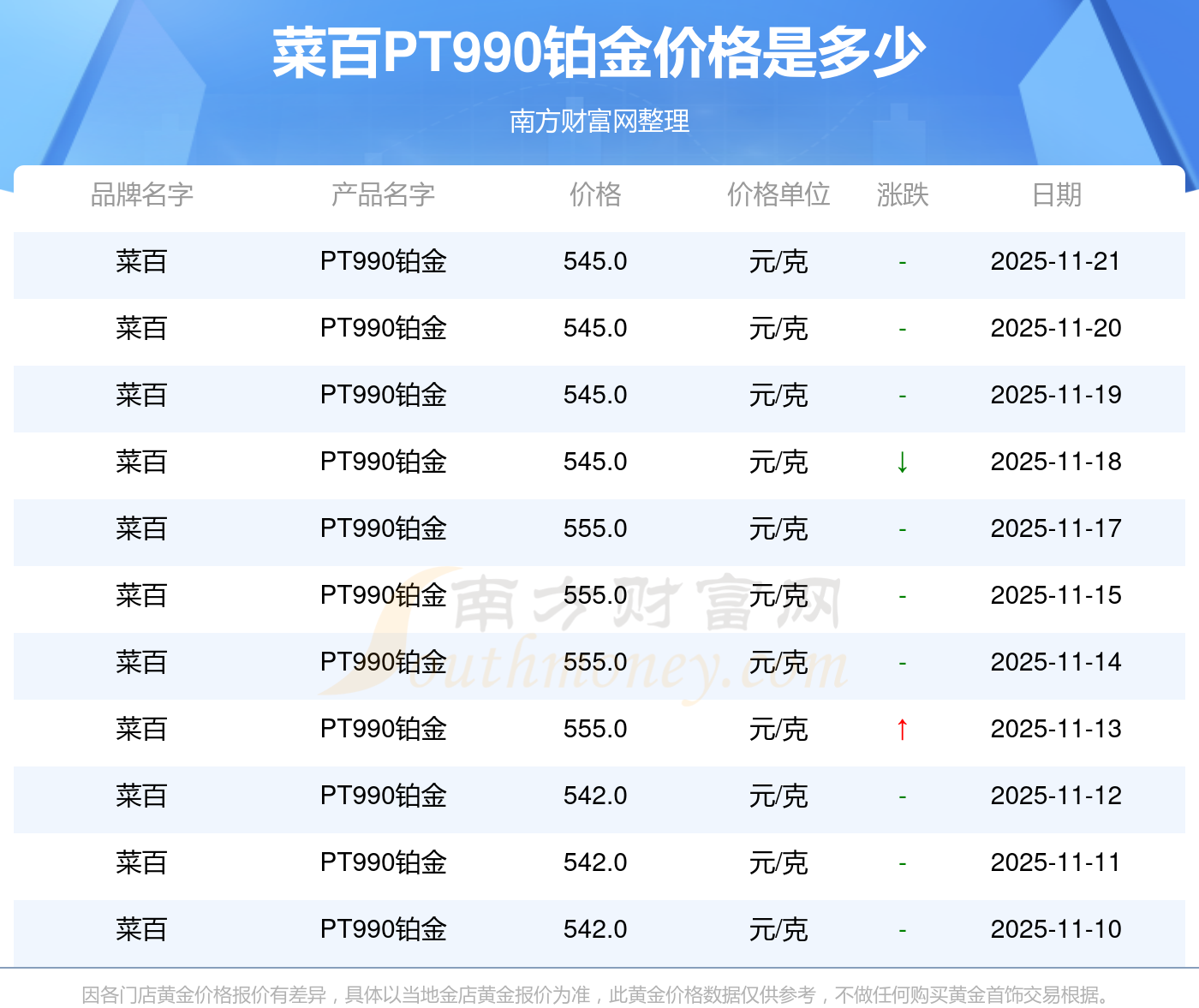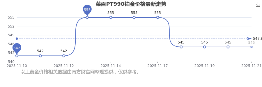 545.0元/克是菜百在今日给出的 PT990铂金最新价格。