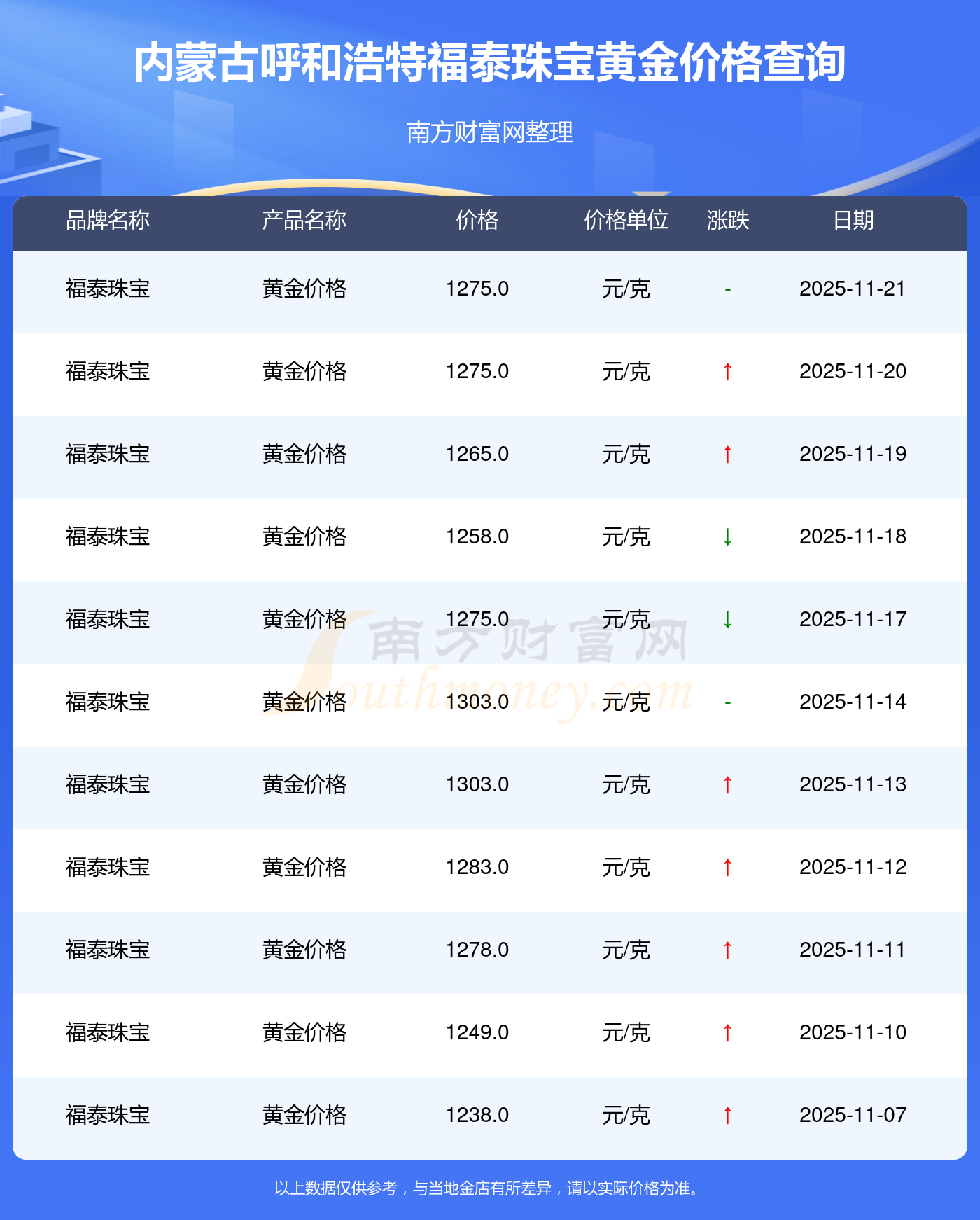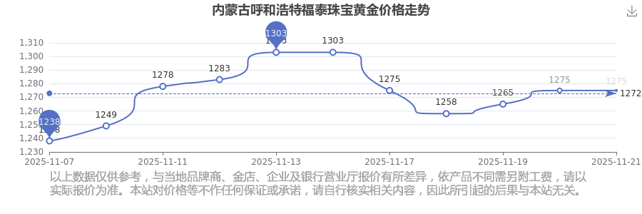 2025年11月22日,内蒙古呼和浩特福泰珠宝黄金价格每克的价值量定格在1275.0元/克。