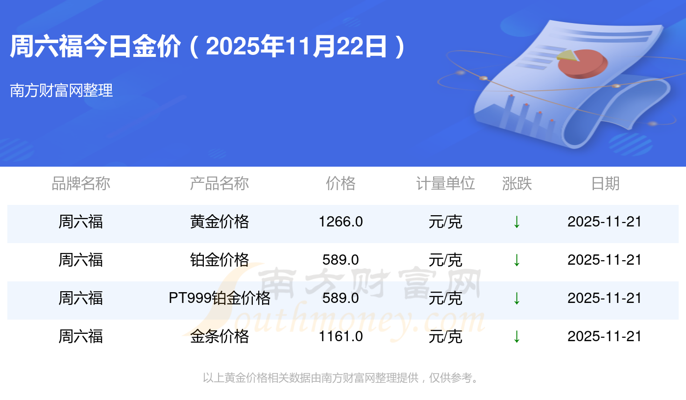 今天是2025年11月22日,周大福、周大福、周大福、周大福、周大福、周大福、周大福、老凤祥、老凤祥、老凤祥、周六福等各大金店品牌黄金价格最新价格如下:周大福1305.0元/克、周大福616.0元/克、周大福1305.0元/克、周大福45110.0、周大福17570.0、周大福40690.0、周大福1143.0元/克、老凤祥1298.0元/克、老凤祥600.0元/克、老凤祥1298.0元/克、周六福1266.0元/克。